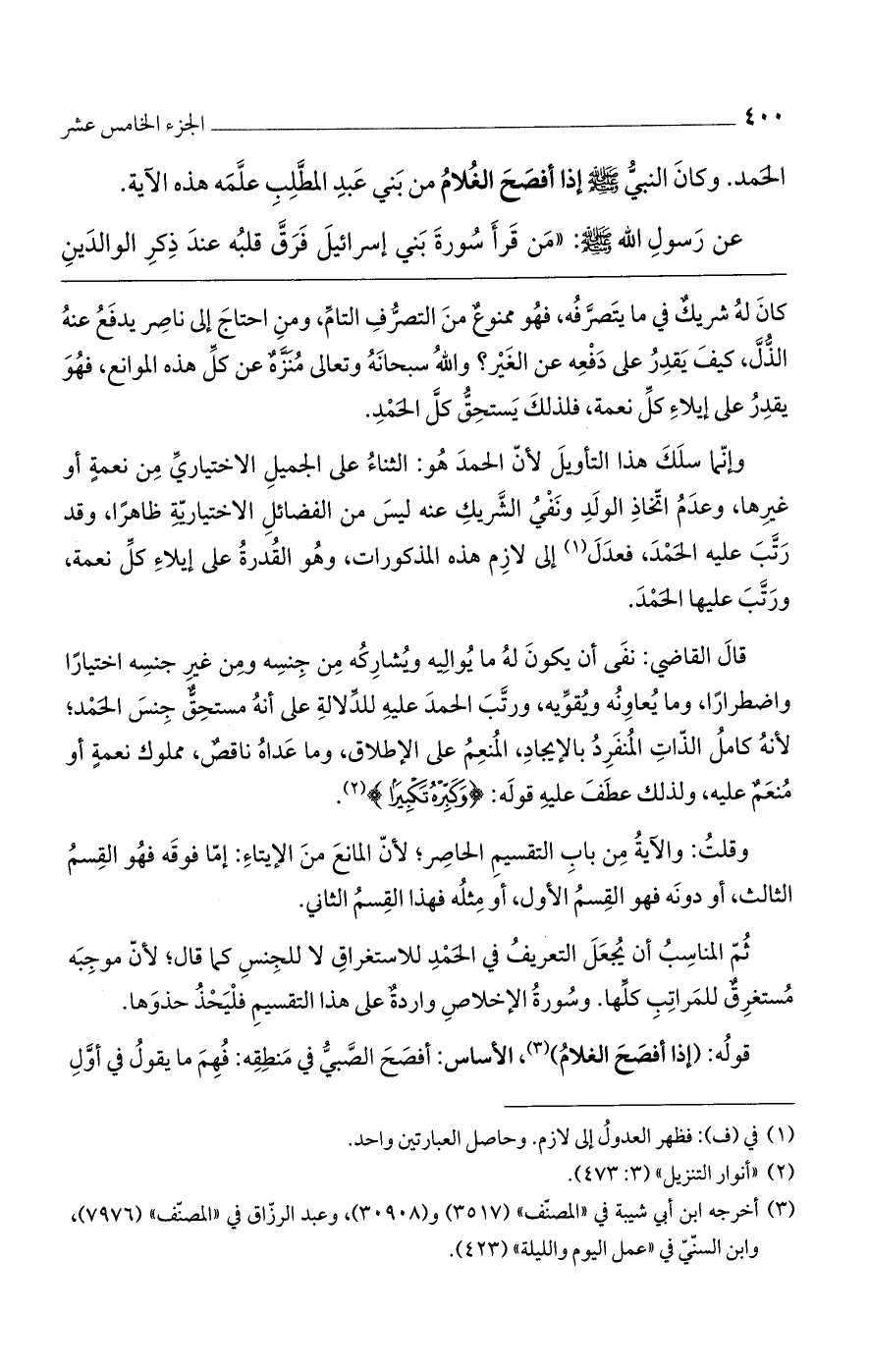 ثم المناسب أن يُجعل التعريف في الحمد للاستغراق لا للجنس كما قال؛ لأن موجبه مستغرقٌ للمراتب كلها. وسورة الإخلاص واردة على هذا التقسيم فليحذُ حذوها.