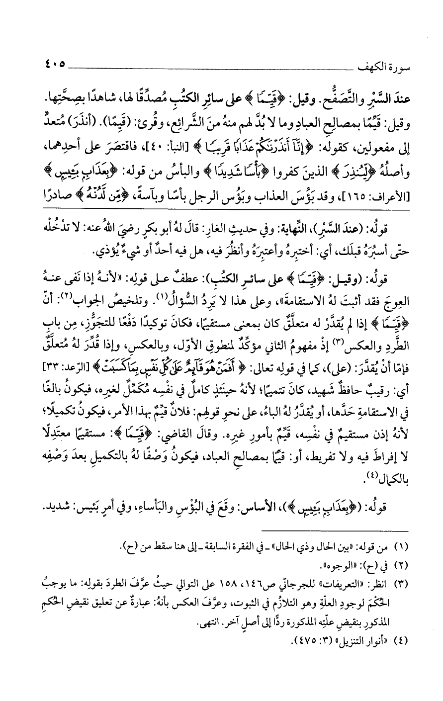 قوله: (وقيل: (قَيِّماً) على سائر الكتُب): عطفٌ على قوله: "لأنه إذا نفى عنه العوج فقد أثبت له الاستقامة"، وعلى هذا لا يرد السؤال. وتلخيص الجواب: أن (قَيِّماً) إذا لم يقدر له متعلقٌ كان بمعنى مستقيماً، فكان توكيداً دفعاً للتجوز، من باب الطرد والعكس إذ مفهوم الثاني مؤكدٌ لمنطوق الأول، وبالعكس، وإذا قُدر له متعلق فإما أن يُقدر: (على)، كما في قوله تعالى: (أَفَمَنْ هُوَ قَائِمٌ عَلَى كُلِّ نَفْسٍ بِمَا كَسَبَتْ) [الرعد: 33] أي: رقيبٌ حافظٌ شهيد، كان تتميماً؛ لأنه حينئذٍ كاملٌ في نفسه مكملٌ لغيره، فيكون بالغاً في الاستقامة حدها، أو يقدرُ له الباء، على نحو قولهم: فلانٌ قيمٌ بهذا الأمر، فيكون تكميلاً؛ لأنه إذن مستقيمٌ في نفسه، قيمٌ بأمور غيره. وقال القاضي: (قَيِّماً): مستقيماً معتدلاً لا إفراط فيه ولا تفريط، أو: قيماً بمصالح العباد، فيكون وصفاً له بالتكميل بعد وصفه بالكمال.