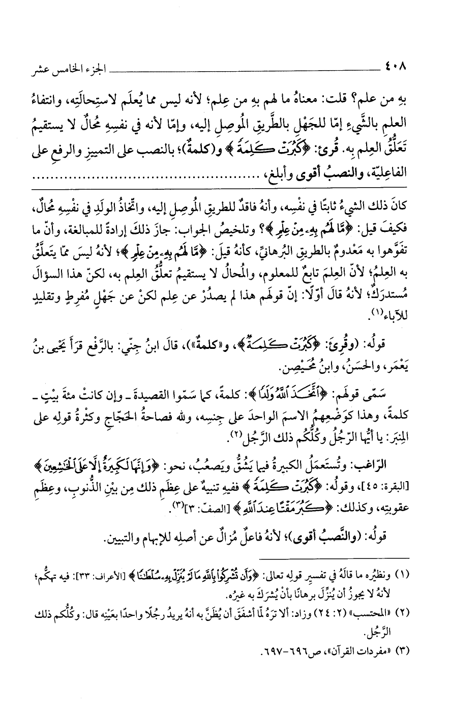 به من علم؟ قلت: معناه ما لهم به من علم؛ لأنه ليس مما يعلم لاستحالته، وانتفاء العلم بالشيء إمّا للجهل بالطريق الموصل إليه، وإما لأنه في نفسه محال لا يستقيم تعلق العلم به. قرئ: (كبرت كلمة) و (كلمة)؛ بالنصب على التمييز والرفع على الفاعلية، والنصب أقوى وأبلغ،