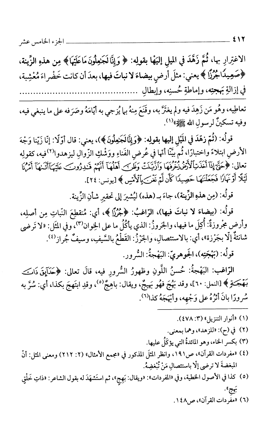 قوله: (ثم زهد في الميل إليها بقوله: (وَإِنَّا لَجَاعِلُونَ))، يعني: قال أولاً: إنا زينا وجه الأرض ابتلاء واختباراً، ثم بينا أنها في عُرض الفناء ووشك الزوال ليزهدوا فيه، كقوله تعالى: (حَتَّى إِذَا أَخَذَتْ الأَرْضُ زُخْرُفَهَا وَازَّيَّنَتْ وَظَنَّ أَهْلُهَا أَنَّهُمْ قَادِرُونَ عَلَيْهَا أَتَاهَا أَمْرُنَا لَيْلاً أَوْ نَهَاراً فَجَعَلْنَاهَا حَصِيداً كَأَنْ لَمْ تَغْنَ بِالأَمْسِ) [يونس: 24].