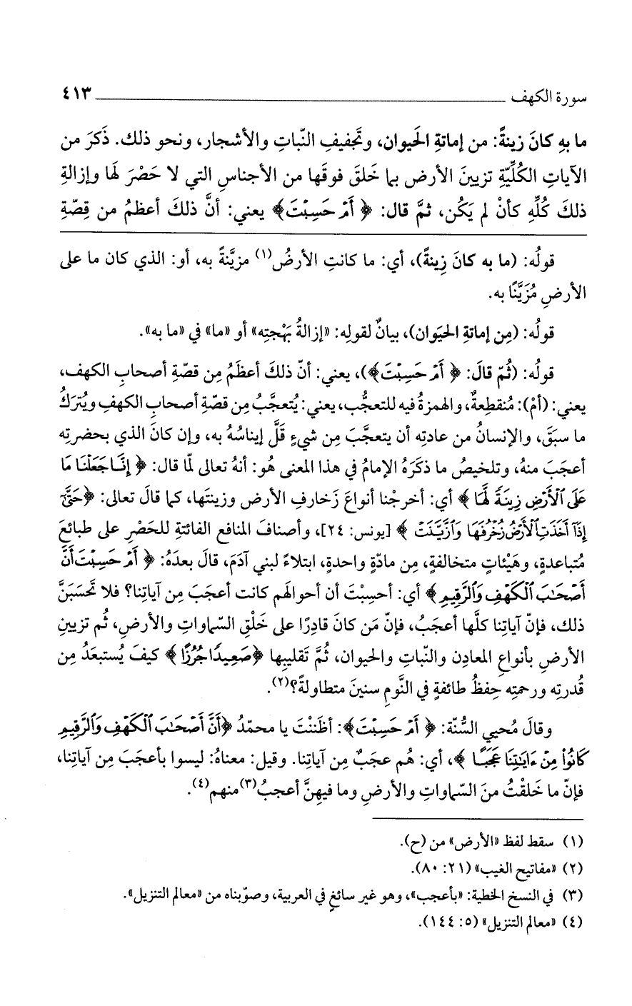 وقال محيي السُّنة: (أَمْ حَسِبْتَ): أظننت يا محمد (أَنَّ أَصْحَابَ الْكَهْفِ وَالرَّقِيمِ كَانُوا مِنْ آيَاتِنَا عَجَباً)، أي: هم عجبٌ من آياتنا. وقيل: معناه: ليسوا بأعجب من آياتنا، فإن ما خلقتُ من السماوات والأرض وما فيهن أعجبُ منهم.