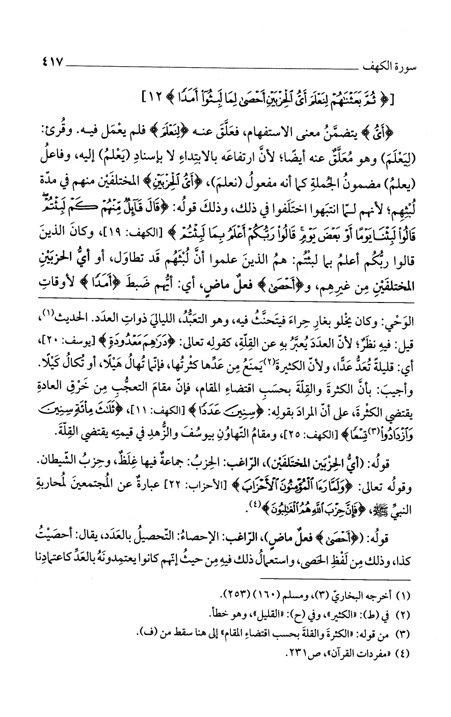 (أَيُّ) يتضمن معنى الاستفهام، فعلق عنه (لِنَعْلَمَ) فلم يعمل فيه. وقرئ: (ليعلم) وهو معلق عنه أيضا؛ لأن ارتفاعه بالابتداء لا بإسناد «يعلم» إليه، وفاعل «يعلم» مضمون الجملة كما أنه مفعول «نعلم»، (أَيُّ الْحِزْبَيْنِ) المختلفين منهم في مدّة لبثهم؛ لأنهم لما انتبهوا اختلفوا في ذلك، وذلك قوله: (قالَ قائِلٌ مِنْهُمْ كَمْ لَبِثْتُمْ قالُوا لَبِثْنا يَوْماً أَوْ بَعْضَ يَوْمٍ قالُوا رَبُّكُمْ أَعْلَمُ بِما لَبِثْتُمْ) [الكهف: 19]، وكان الذين قالوا ربكم أعلم بما لبثتم: هم الذين علموا أن لبثهم قد تطاول، أو أي الحزبين المختلفين من غيرهم، و (أَحْصى) فعل ماض، أي: أيهم ضبط (أَمَداً) لأوقات