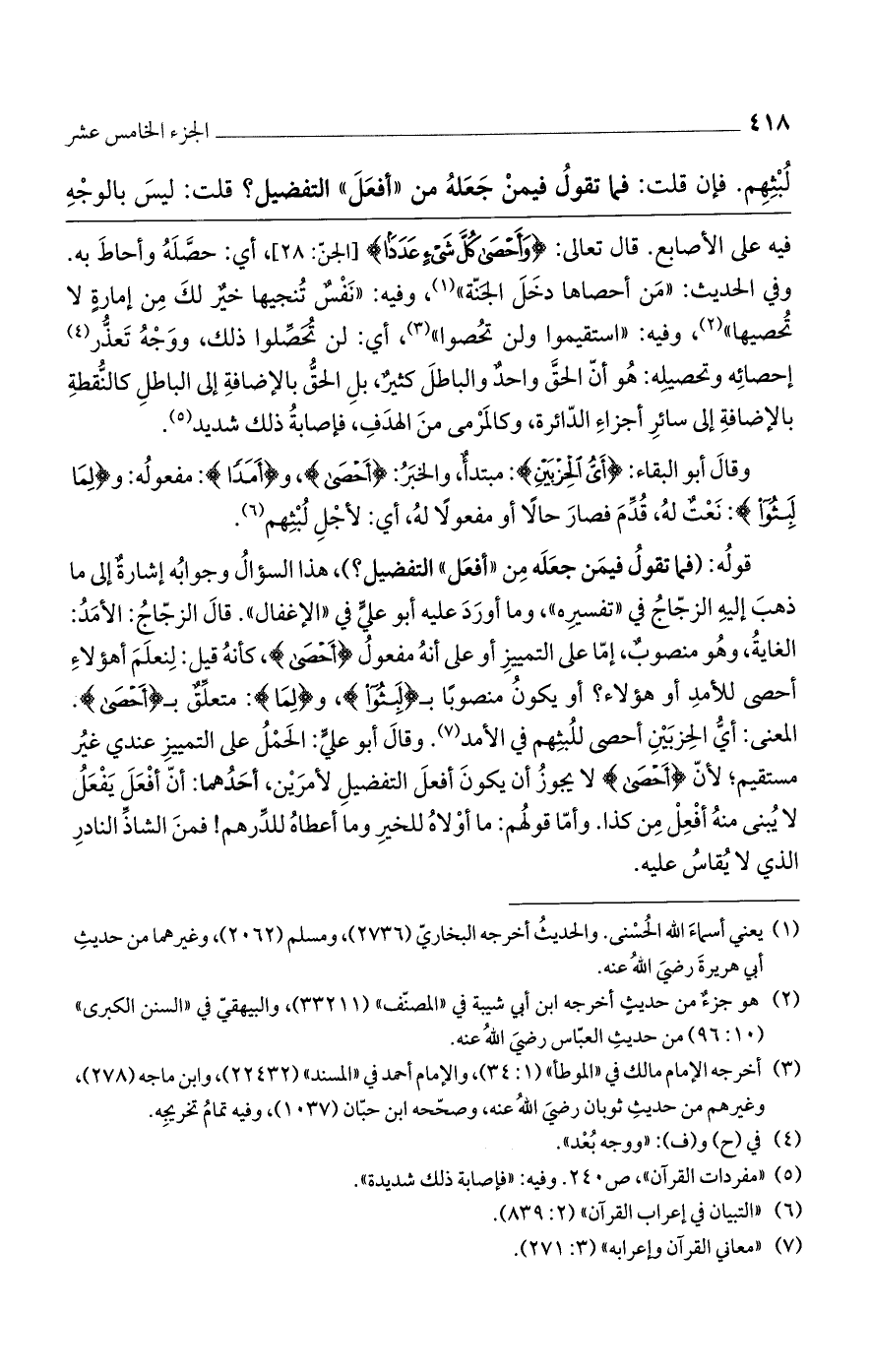 قوله: (فما تقول فيمن جعله من "أفعل" التفضيل؟ )، هذا السؤال وجوابه إشارة على ما ذهب إليه الزجاج في "تفسيره"، وما أورد عليه أبو علي في "الإغفال". قال الزجاج: الأمد: الغاية، وهو منصوبٌ، إما على التمييز أو على أنه مفعول (أَحْصَى)، كأنه قيل: لنعلَمَ أهؤلاءِ أحصى للأمد أو هؤلاء؟ أو يكون منصوباً بـ (لَبِثُوا)، و (لِمَا): متعلق بـ (أَحْصَى). المعنى: أي الحزبين أحصى للُبثهم في الأمد. وقال أبو علي: الحمل على التمييز عندي غير مستقيم؛ لأن (أَحْصَى) لا يجوز أن يكون أفعل التفضيل لأمرين، أحدهما: أن أفعل يفعل لا يُبنى منه أفْعِلْ من كذا. وأما قولهم: ما أولاه للخير وما أعطاه للدرهم! فمن الشاذ النادر الذي لا يُقاس عليه.
