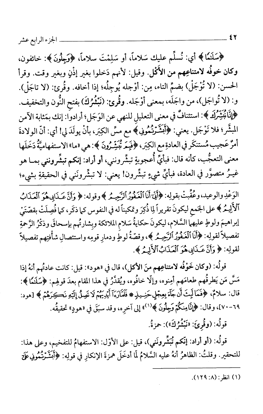 (سَلاماً) أي: نسلم عليك سلاماً، أو سلمت سلاماً، (وَجِلُونَ): خائفون، وكان خوفه لامتناعهم من الأكل. وقيل: لأنهم دخلوا بغير إذن وبغير وقت. وقرأ الحسن: (لا توجل)، بضم التاء، من أوجله يوجله؛ إذا أخافه. وقرئ: لا تأجل. ولا تواجل، من واجله بمعنى أوجله. وقرئ (نُبَشِّرُكَ) بفتح النون والتخفيف إِنَّا نُبَشِّرُكَ استئناف في معنى التعليل للنهى عن الوجل؛ أرادوا: أنك بمثابة الآمن المبشر؛ فلا توجل. يعنى: (أَبَشَّرْتُمُونِي) مع مس الكبر، بأن يولد لي! أي: أن الولادة أمر عجيب مستنكر في العادة مع الكبر، (فَبِمَ تُبَشِّرُون) هي "ما" الاستفهامية دخلها معنى التعجب، كأنه قال: فبأي أعجوبة تبشروني، أو أراد: أنكم تبشرونني بما هو غير متصوّر في العادة، فبأي شيء تبشرون، يعنى: لا تبشرونني في الحقيقة بشيء؛
