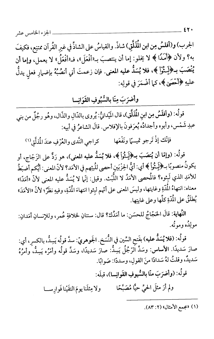 الجرب)، و «أفلس من ابن المذلق» شاذ. والقياس على الشاذ في غير القرآن ممتنع، فكيف به؟ ولأن (أَمَداً) لا يخلو: إما أن ينتصب بـ (أفعل)، فـ (أفعل) لا يعمل، وإما أن ينصب بـ (لبثوا)، فلا يسدّ عليه المعنى. فإن زعمت أني