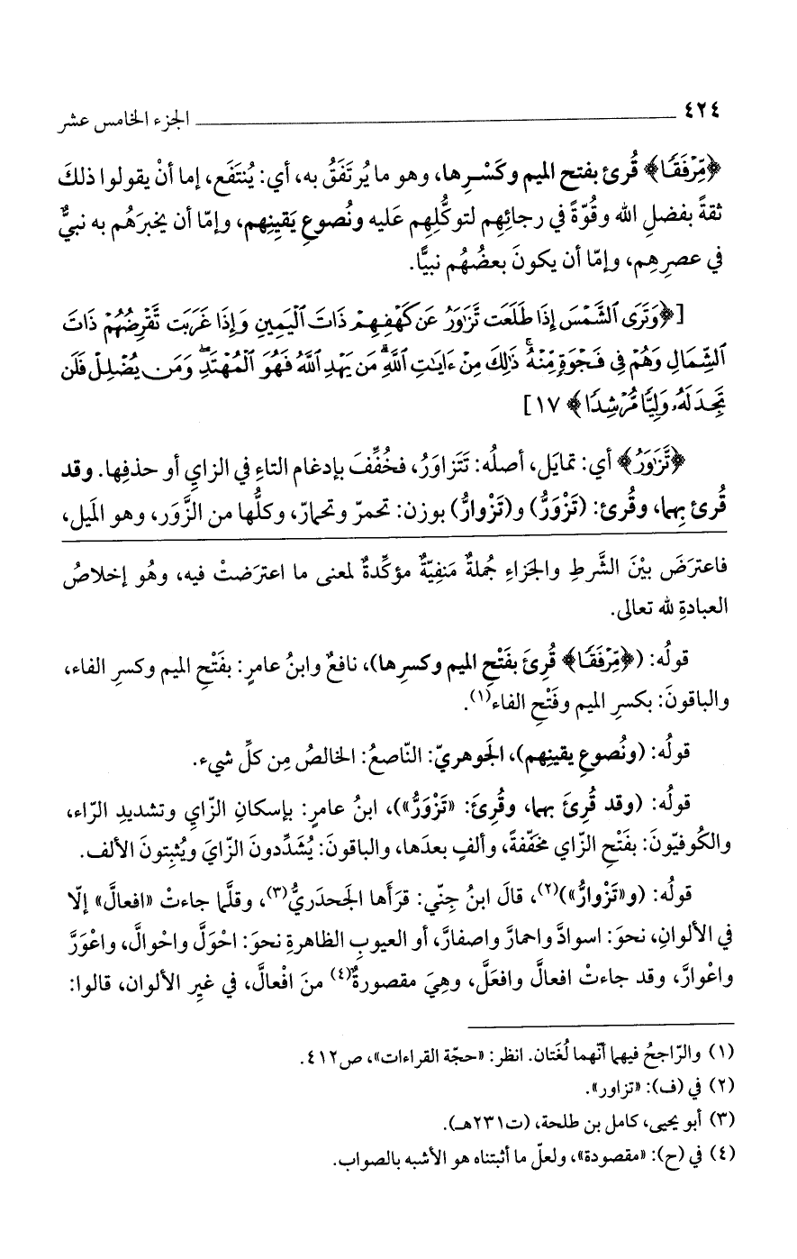قوله: (وقد قرئ بهما، وقرئ: "تزور")، ابن عامرٍ: بإسكان الزاي وتشديد الراء، والكوفيون: بفتح الزاي مخففة، وألفٍ بعدها، والباقون: يشددون الزاي ويثبتون الألف.
