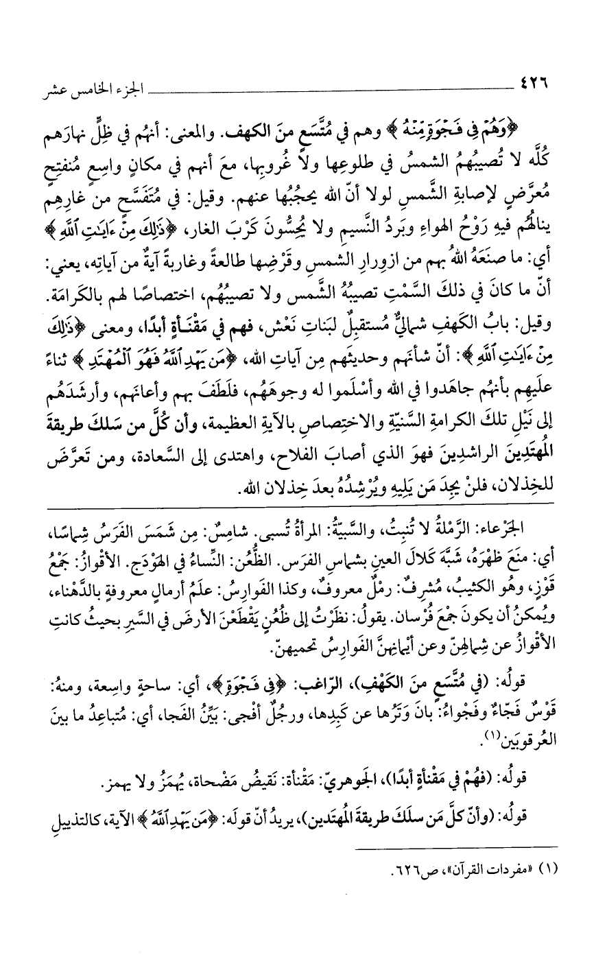 قوله: (في متسع من الكهف)، الراغب: (فِي فَجْوَةٍ)، أي: ساحة واسعة، ومنه: قوسٌ فجاءٌ وفجواءُ: بان وترُها عن كبدها، ورجلٌ أفجي: بينُ الفجا، أي: متباعد ما بين العرقوبين.
