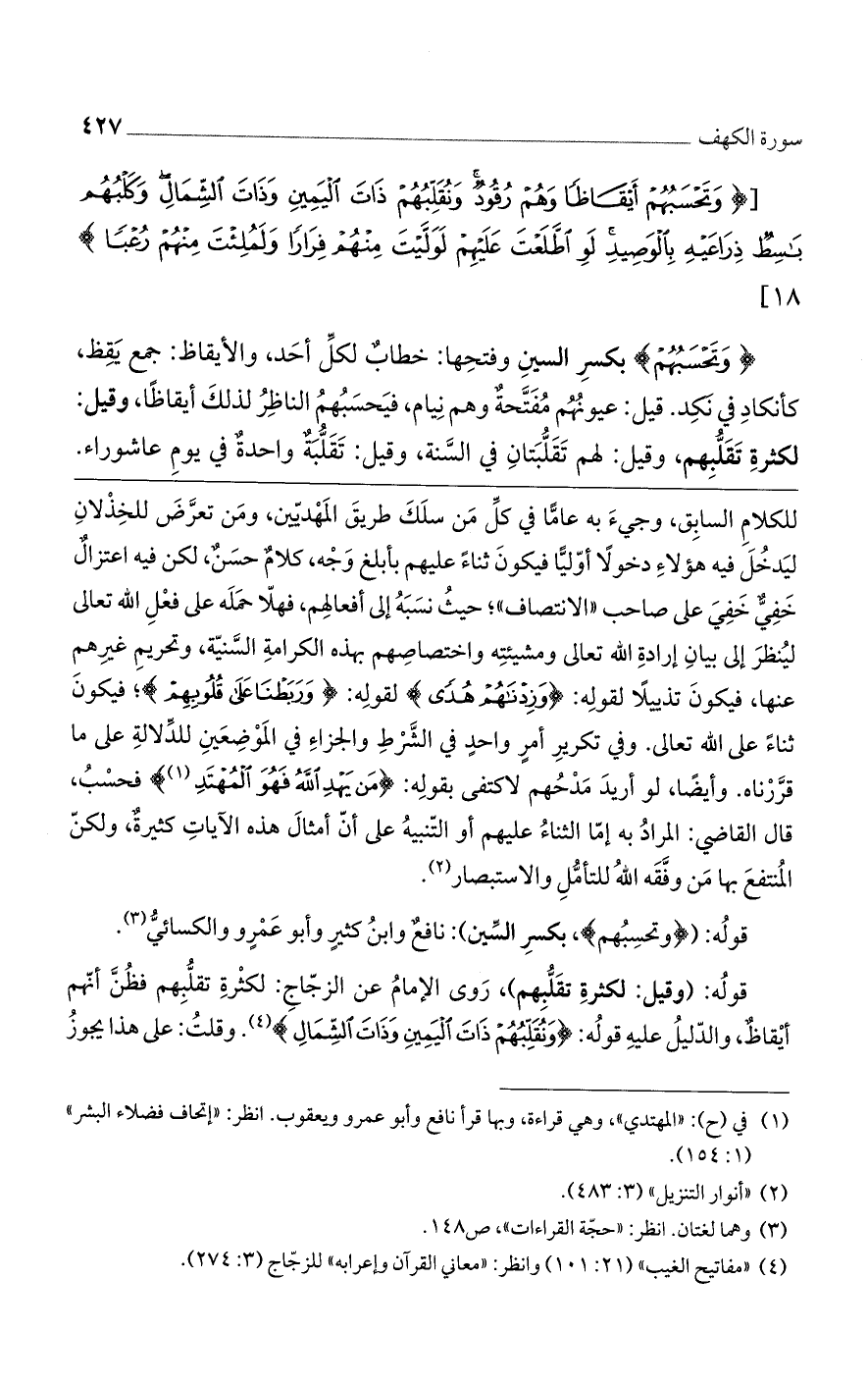 قوله: (وقيل: لكثرة تقلبهم)، روى الإمام عن الزجاج: لكثرة تقلبهم فظُنَّ أنهم أيقاظٌ، والدليل عليه قوله: (وَنُقَلِّبُهُمْ ذَاتَ الْيَمِينِ وَذَاتَ الشِّمَالِ). وقلتُ: على هذا يجوز