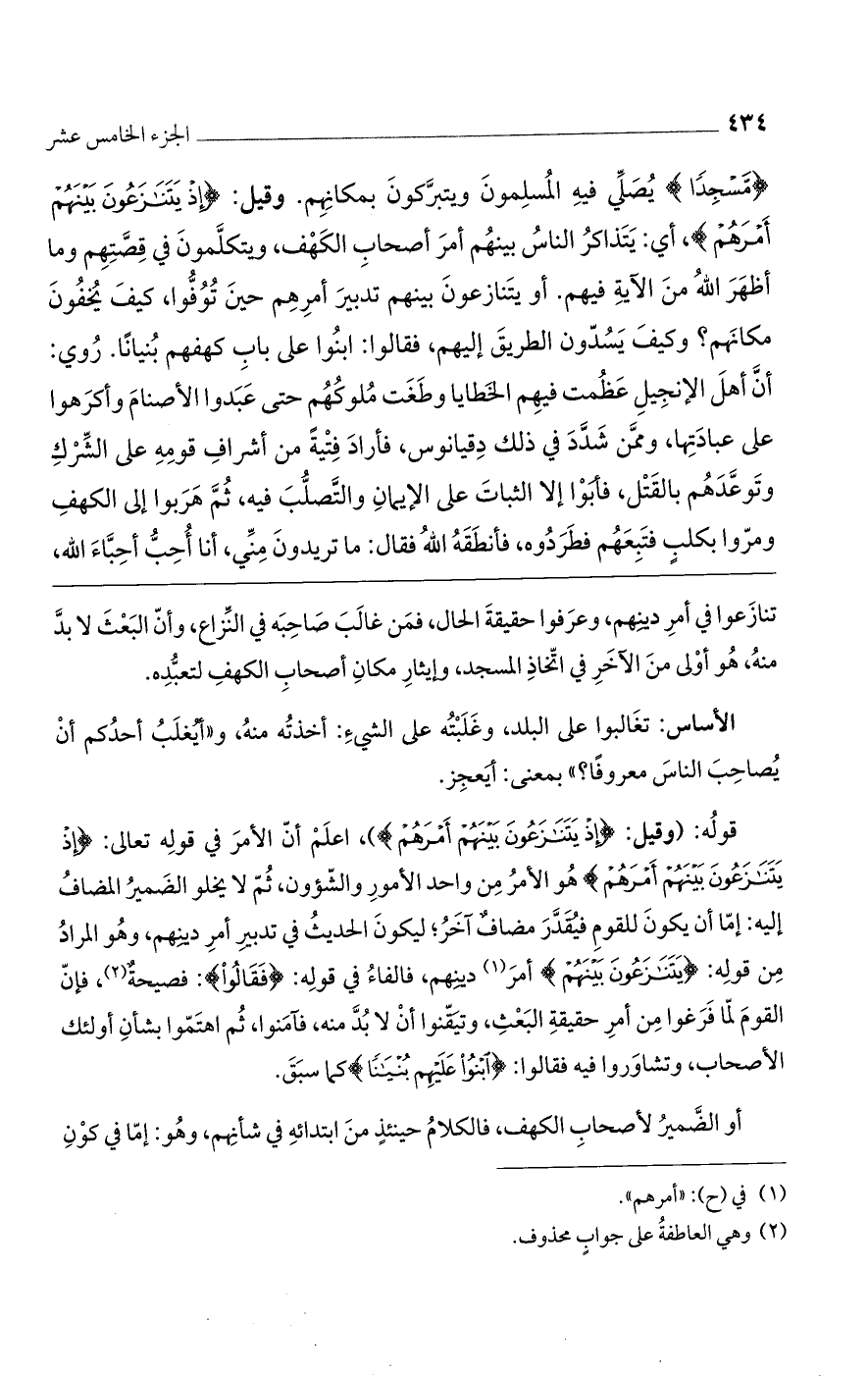 قوله: (وقيل: (إِذْ يَتَنَازَعُونَ بَيْنَهُمْ أَمْرَهُمْ))، اعلم أن الأمر في قوله تعالى: (إِذْ يَتَنَازَعُونَ بَيْنَهُمْ أَمْرَهُمْ) هو الأمر من واحد الأمور والشؤون، ثم لا يخلو الضمير المضاف إليه: غما أن يكون للقوم فيُقدر مضافٌ آخر؛ ليكون الحديث في تدبير أمر دينهم، وهو المراد من قوله: (يَتَنَازَعُونَ بَيْنَهُمْ) أمر دينهم، فالفاء في قوله: (فَقَالُوا): فصيحةٌ، فإن القوم لما فرغوا من أمر حقيقة البعث، وتيقنوا أن لابد منه، فآمنوا، ثم اهتموا بشأن أولئك الأصحاب، وتشاوروا فيه فقالوا: (ابْنُوا عَلَيْهِمْ بُنْيَاناً) كما سبق.