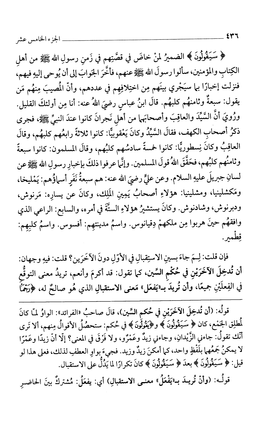 قوله: (أن تُدخل الآخرين في حكم السين)، قال صاحب "الفرائد": الواو لما كان لمطلق الجمع، كان (سَيَقُولُونَ) و (يَقُولُونَ) في حُم: ستحصل الأقوال منهم، ألا ترى أنك تقول: جاءني الزيدان، وجاءني زيدٌ وعمرو، ولا فرق في المعنى؟ إلا أن زيداً وعمراً لا يمكن جمعهما بلفظٍ واحد، كما أمكن زيدٌ وزيد. فجيء بواو العطف لذلك، فعلى هذا لو قيل: (سَيَقُولُونَ) بعد (سَيَقُولُونَ) كان تكراراً لما يدل على الاستقبال.