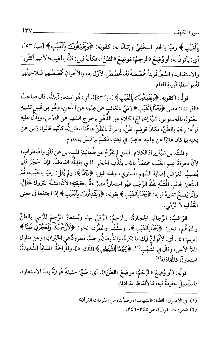 وقلت: بل شبه إيراد الكلام- الذي لم يخرج عن طمأنينة قلب، بلعن قلق واضطراب؛ لأن معرفة علم الغيب مختصة بالله - بقذف الحجر الذي يقذفه القاذف، فإن الحجر قلما يُصيب الغرض إصابة السهم المستوي، ولهذا قيل: (رَجْماً)، ولم يُقل: رمياً بالغيب، ثم استعير لجانب المشبه لفظ الرجم، فهو استعارةٌ مصرة بحقيقته؛ لأن المشبه المتروك عقلي؛ وإنما يصح تشبهي قوله: (رَجْماً بِالْغَيْبِ) بقوله: (وَيَقْذِفُونَ بِالْغَيْبِ) إذا اجتمعا في معنى القذف لا الرمي.