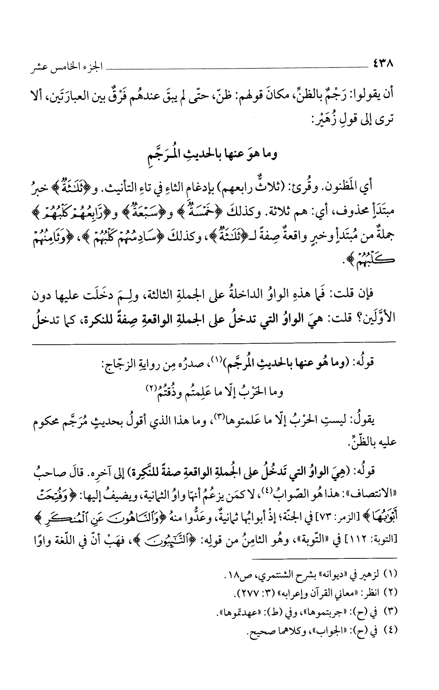 قوله: (هي الواو التي تدخل على الجملة الواقعة صفة للنكرة) إلى آخره. قال صاحب "الانتصاف": هذا هو الصواب، لا كمن يزعم أنها واو الثمانية، ويضيف إليها: (وَفُتِحَتْ أَبْوَابُهَا) [الزمر: 73] في الجنة؛ إذ أبوابها ثمانية، وعدوا منه (وَالنَّاهُونَ عَنْ الْمُنكَرِ) [التوبة: 112] في "التوبة"، وهو الثامن من قوله: (التَّائِبُونَ)، فهب أن في اللغة واواً