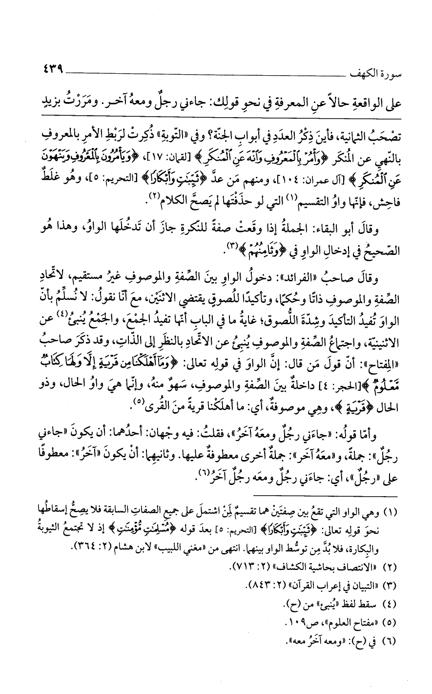 وقال صاحب "الفرائد": دخول الواو بين الصفة والموصوف غير مستقيم، لاتحاد الصفة والموصوف ذاتاً وحكما، وتأكيداً للصوق يقتضي الاثنين، مع أنا نقول: لا نسلم بأن الواو تفيد التأكيد وشدة اللصوق؛ غاية ما في الباب أنها تفيد الجمع، والجمع ينبئ عن الاثنينية، واجتماع الصفة والموصوف ينبئ عن الاتحاد بالنظر إلى الذات، وقد ذكر صاحب "المفتاح": أن قول من قال: إن الواو في قوله تعالى: (وَمَا أَهْلَكْنَا مِنْ قَرْيَةٍ إِلاَّ وَلَهَا كِتَابٌ مَعْلُومٌ) [الحجر: 4] داخلةٌ بين الصفة والموصوف، سهو منه، وإنما هي واو الحال، وذو الحال (قَرْيَةٍ)، وهي موصوفة، أي: ما أهلكنا قرية من القرى.