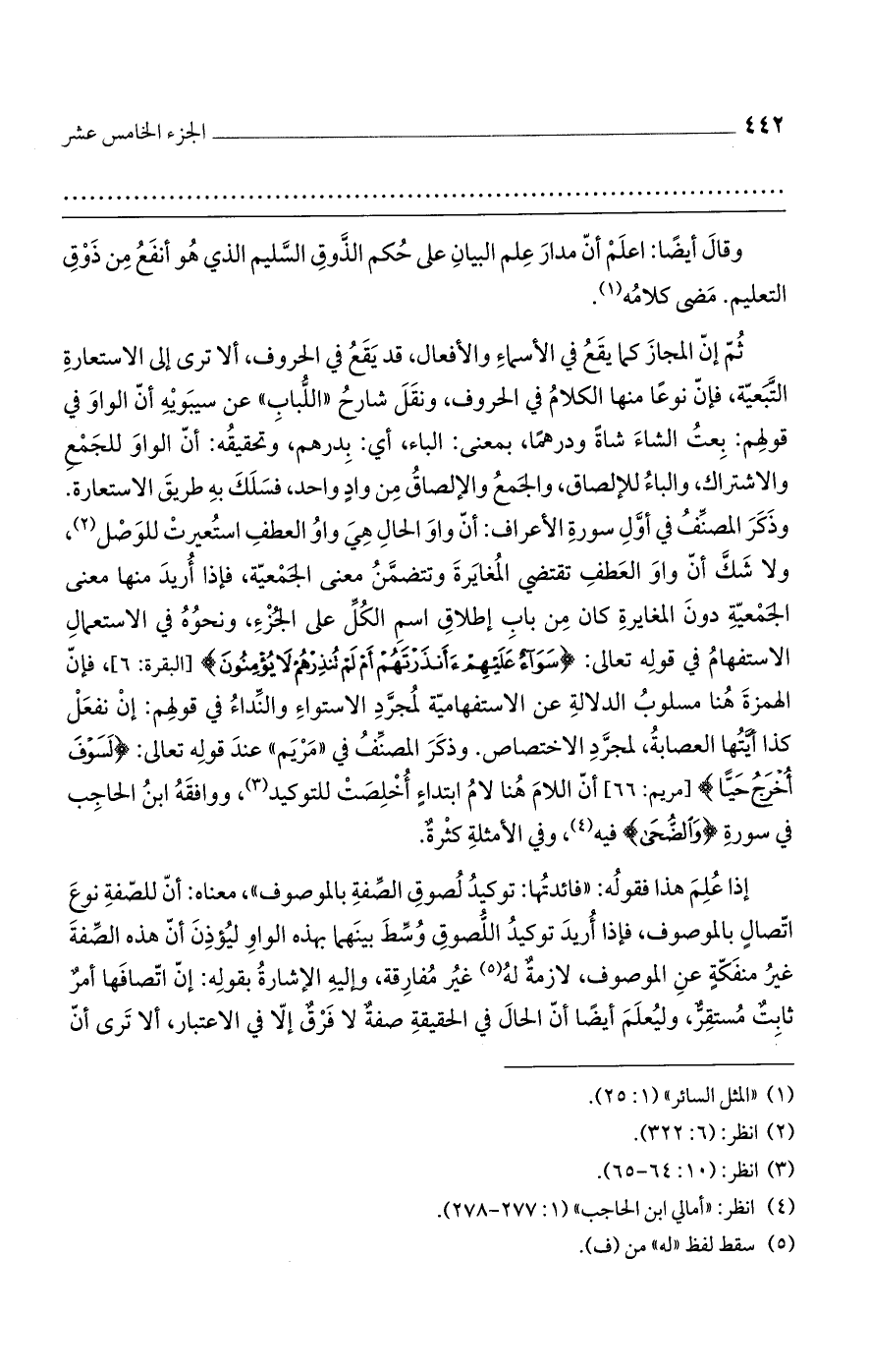 وقال أيضاً: اعلم أن مدار علم البيان على حكم الذوق السليم الذي هو أنفع من ذوق التعليم مضى كلامه.