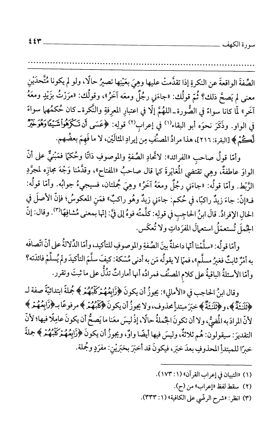 وقال ابن الحاجب في "الأمال": يجوز أن يكون (رَابِعُهُمْ كَلْبُهُمْ) جملة ابتدائية صفة لـ (ثَلاثَةٌ)، و (ثَلاثَةٌ) خبر مبتدأ محذوف، ولا يجوز أن يكون (كَلْبُهُمْ) مرفوعاً بـ (رَابِعُهُمْ) لأن المراد به المضي، ولا أن تكون الجمة حالاً، إذ ليس معنا ما يصح أن يكون عاملاً فيها؛ لأن التقدير: سيقولون: هم ثلاثة، وليس فيها أيضاً واوٌ، ويجو أن يكون (رَابِعُهُمْ كَلْبُهُمْ) جملة خبراً للمبتدأ المحذوف بعد خبر، فيكون قد أخبر بخبرين: مفرد وجملة.