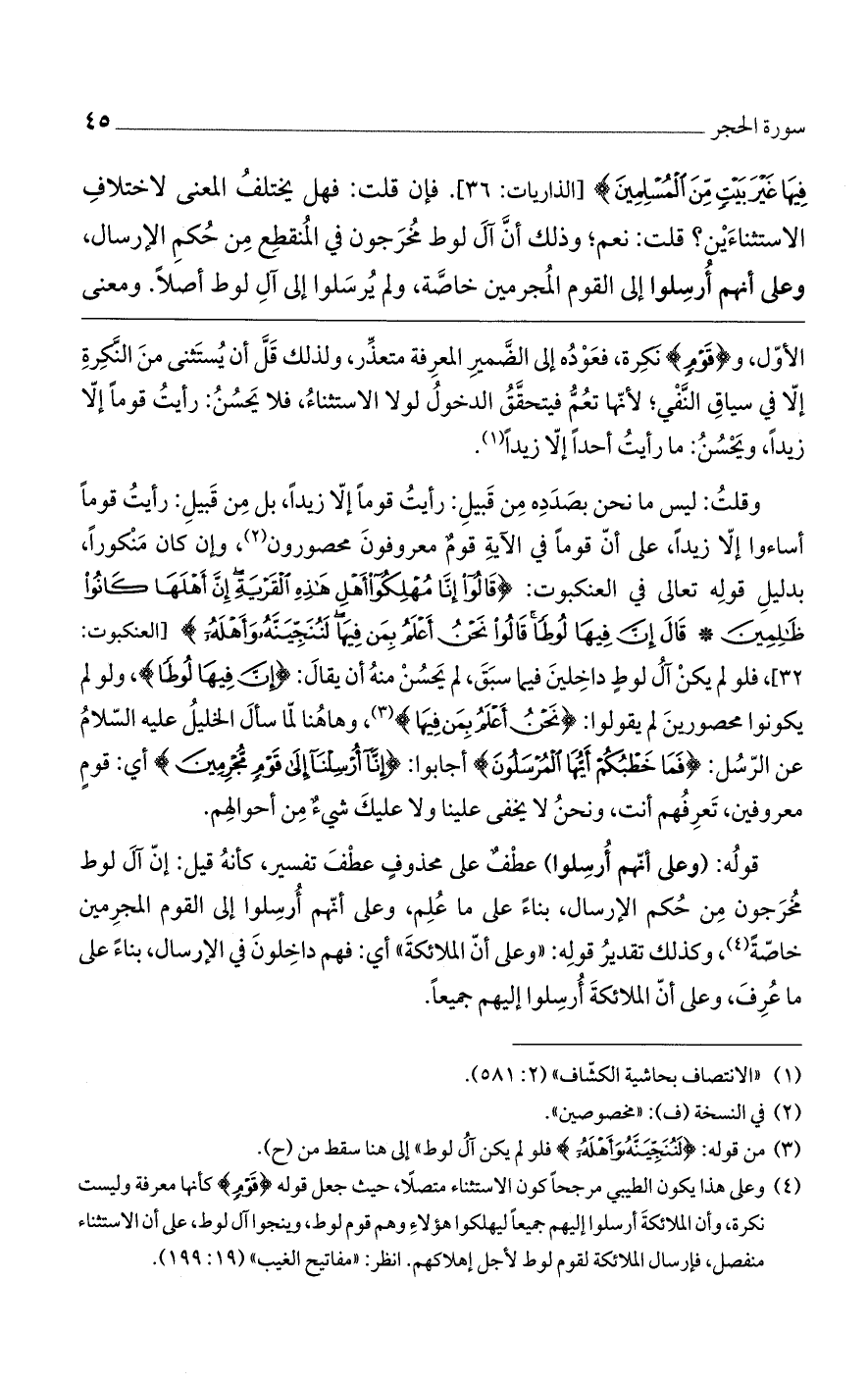 وقلت: ليس ما نحن بصدده من قبيل: رأيت قوماً إلا زيداً، بل من قبيل: رأيت قوماً أساءوا إلا زيداً، على أن قوماً في الآية قوم معروفون محصورون، وإن كان منكوراً، بدليل قوله تعالى في العنكبوت: (قَالُوا إِنَّا مُهْلِكُو أَهْلِ هَذِهِ الْقَرْيَةِ إِنَّ أَهْلَهَا كَانُوا ظَالِمِينَ * قَالَ إِنَّ فِيهَا لُوطاً قَالُوا نَحْنُ أَعْلَمُ بِمَنْ فِيهَا لَنُنَجِّيَنَّهُ وَأَهْلَهُ) [العنكبوت: 32]، فلو لم يكن آل لوط داخلين فيما سبق، لم يحسن منه أن يقال: (إِنَّ فِيهَا لُوطاً)، ولو لم يكونوا محصورين لم يقولوا: (نَحْنُ أَعْلَمُ بِمَنْ فِيهَا)، وهاهنا لما سأل الخليل عليه السلام عن الرسل: (فَمَا خَطْبُكُمْ أَيُّهَا الْمُرْسَلُونَ) أجابوا: (إِنَّا أُرْسِلْنَا إِلَى قَوْمٍ مُجْرِمِينَ) أي: قومٍ معروفين، تعرفهم أنت، ونحن لا يخفى علينا ولا عليك شيء من أحوالهم.