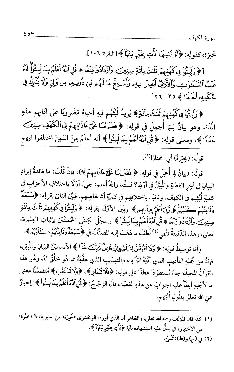 قوله: (بيان لما أُجمل في قوله: (فَضَرَبْنَا عَلَى آذَانِهِمْ))، فإن قلت: ما فائدة إيراد البيان في آخر القصة والمبين في أولها قلتُ، والله أعلم: جيء أولاً باختلاف الأحزاب في كمية لُبثهم في الكهف. وثانياً: باختلافهم في كمية أشخاصهم، فبين الثاني بقوله: (سَبْعَةٌ وَثَامِنُهُمْ كَلْبُهُمْ قُلْ رَبِّي أَعْلَمُ بِعِدَّتِهِمْ) وبين الأول بقوله: (وَلَبِثُوا فِي كَهْفِهِمْ ثَلاثَ مِائَةٍ سِنِينَ وَازْدَادُوا تِسْعاً * قُلْ اللَّهُ أَعْلَمُ بِمَا لَبِثُوا) وسجل لكلتي الجملتين بإثبات العلم لله تعالى، وهذه الدقيقة تنهي لطف ما ذهب إليه المصنف في (سَبْعَةٌ وَثَامِنُهُمْ كَلْبُهُمْ).