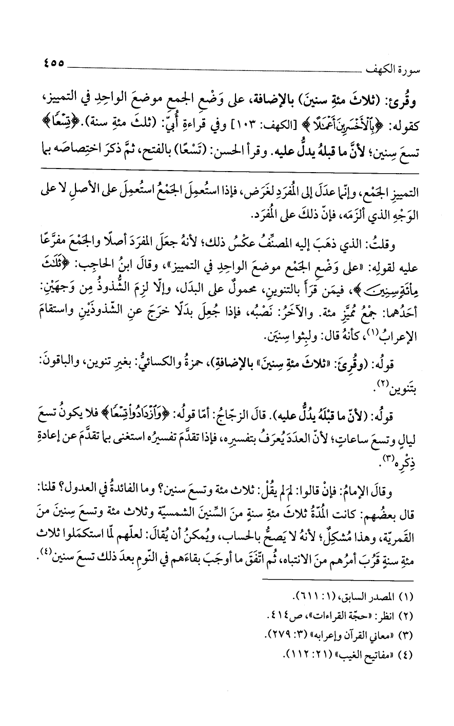 قوله: (وقرئ: "ثلاث مئة سنين" بالإضافة)، حمزة والكسائي: بغير تنوين، والباقون: بتنوين.