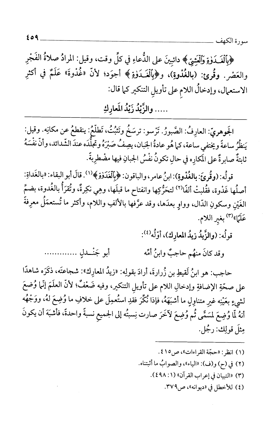 حاجب: هو ابن لقيط بن زُرارة، أراد بقوله: "زيدُ المعارك": شجاعته، ذكره شاهداً على صحة الإضافة وإدخال اللام على تأويل التنكير، وفيه ضعفٌ؛ لأن العلم إنما وُضع لشيء بعينه غير متناول ما أشبهه، فإذا نُكر فقد استعمل على خلاف ما وُضع له، ووجهه أنه لما وُضع لمسمى ثم وُضع لآخر صارت نسبته إلى الجميع نسبةً واحدةً، فأشبه أن يكون مثل قولك: رجُل.