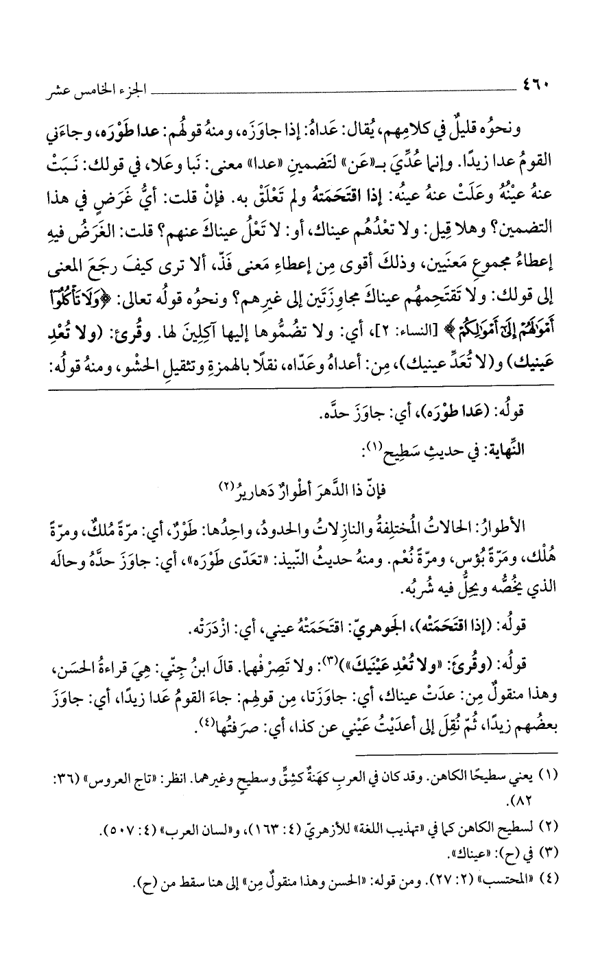 ونحوه قليل في كلامهم. يقال: عداه إذا جاوزه ومنه قولهم. عدا طوره. وجاءني القوم عدا زيدا. وإنما عدى بعن، لتضمين عدا معنى نبا وعلا، في قولك: نبت عنه عينه وعلت عنه عينه: إذا اقتحمته ولم تعلق به. فإن قلت: أي غرض في هذا التضمين؟ وهلا قيل: ولا تعدهم عيناك، أو لا تعل عيناك عنهم؟ قلت الغرض فيه إعطاء مجموع معنيين، وذلك أقوى من إعطاء معنى فذ. ألا ترى كيف رجع المعنى إلى قولك: ولا تقتحمهم عيناك مجاوزتين إلى غيرهم؟ ونحوه قوله تعالى (وَلا تَاكُلُوا أَمْوالَهُمْ إِلى أَمْوالِكُمْ) [النساء: 2]، أي ولا تضموها إليها آكلين لها. وقرئ: ولا تعد عينيك، ولا تعدّ عينيك، من أعداه وعدّاه نقلا بالهمزة وتثقيل الحشو. ومنه قوله: