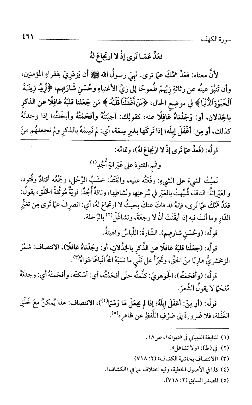 لأن معناه: فعد همك عما ترى. نهى رسول الله صلى الله عليه وسلم أن يزدرى بفقراء المؤمنين، وأن تنبو عينه عن رثاثة زيهم طموحا إلى زىّ الأغنياء وحسن شارتهم (تُرِيدُ زِينَةَ الْحَياةِ الدُّنْيا) في موضع الحال، (مَنْ أَغْفَلْنا قَلْبَهُ) من جعلنا قلبه غافلاً عن الذكر بالخذلان، أو وجدناه غافلا عنه، كقولك: أجبنته وأفحمته وأبخلته، إذا وجدته كذلك. أو من أغفل إبله إذا تركها بغير سمة، أي: لم نسمه بالذكر ولم نجعلهم من
