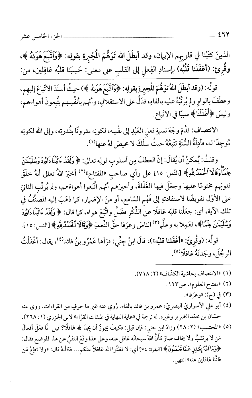 قلتُ: يمكن أن يُقال: إن العطف من أسلوب قوله تعالى: (وَلَقَدْ آتَيْنَا دَاوُودَ وَسُلَيْمَانَ عِلْماً وَقَالا الْحَمْدُ لِلَّهِ) بالنمل: 15] على راي صاحب "المفتاح" أخبر الله تعالى أنه خق قلوبهم مختوماً عليها وجعل فيها الغفلة، وأخبرهم أنهم اتبعوا أهواءهم، ولم يرتب الثاني على الأول تفويضاً لاستفادته إلى فهم السامع، أو من الأضمار، كما ذهب إليه المصنف في تلك الآية، أي: جعلنا قلبه غافلاً عن الذكر فضل واتبع هواه، كما قال: (وَلَقَدْ آتَيْنَا دَاوُودَ وَسُلَيْمَانَ عِلْماً)، فعملا به وعلما الناس وعرفا حق النعمة (وَقَالا الْحَمْدُ لِلَّهِ) [النمل: 15].
