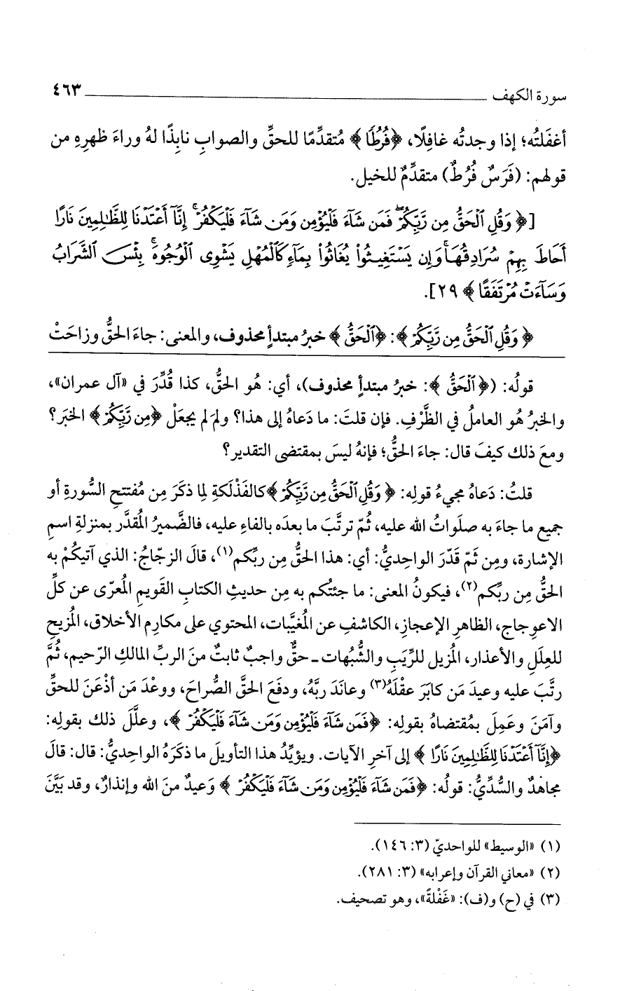 قلتُ: دعاه مجيء قوله: (وَقُلْ الْحَقُّ مِنْ رَبِّكُمْ) كالفذلكة لما ذكر من مفتتح السورة أو جميع ما جاء به صلوات الله عليه، ثم ترتب ما بعده بالفاء عليه، فالضمير المقدر بمنزلة اسم الإشارة، ومن ثم قدر الواحدي: أي: هذا الحق من ربكم، قال الزجاج: الذي آتيكم به الحق من ربكم، فيكون المعنى: ما جئتكم به من حديثا لكتاب القويم المعري عن كل الاعوجاج، الظاهر الإعجاز، الكاشف عن المغيبات، المحتوي على مكارم الأخلاق، المزيح للعلل والأعذار، المزيل للريب والشبهات - حق واجب ثابت من الرب المالك الرحيم، ثم رتب عليه وعيد من كابر عقله وعاند ربه، ودفع الحق الصُّراح، ووعد من أذعن للحق وآمن وعمل بمقتضاه بقوله: (فَمَنْ شَاءَ فَلْيُؤْمِنْ وَمَنْ شَاءَ فَلْيَكْفُرْ)، وعلل ذلك بقوله: (إِنَّا أَعْتَدْنَا لِلظَّالِمِينَ نَاراً) إلى آخر الآيات. ويؤيدُ هذا التأويل ما ذكرهُ الواحدي: قال: قال مجاهدٌ والسديٌّ: قوله: (فَمَنْ شَاءَ فَلْيُؤْمِنْ وَمَنْ شَاءَ فَلْيَكْفُرْ) وعيدٌ من الله وإنذارٌ، وقد بيَّنَ