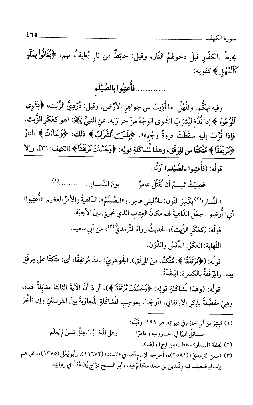 قوله: (وهذا لمشاكلة قوله: (وَحَسُنَتْ مُرْتَفَقاً))، أراد أن الآية الثالثة مقابلةٌ لهذه، وهي مفصلةٌ بذكر الارتفاق، فأوجب بموجب المشاكلة المجاوبة بين القرينتين وإن تأخر