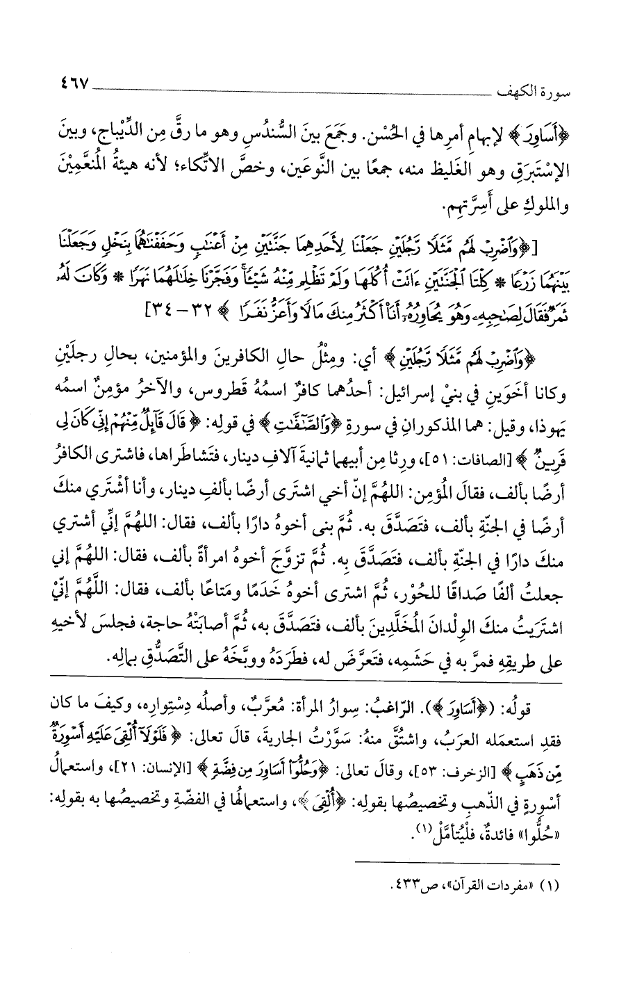 (أَساوِرَ) لإبهام أمرها في الحسن. وجمع بين السندس: وهو ما رقّ من الديباج، وبين الإستبرق: وهو الغليظ منه، جمعا بين النوعين. وخص الاتكاء، لأنه هيئة المنعمين والملوك على أسرتهم.