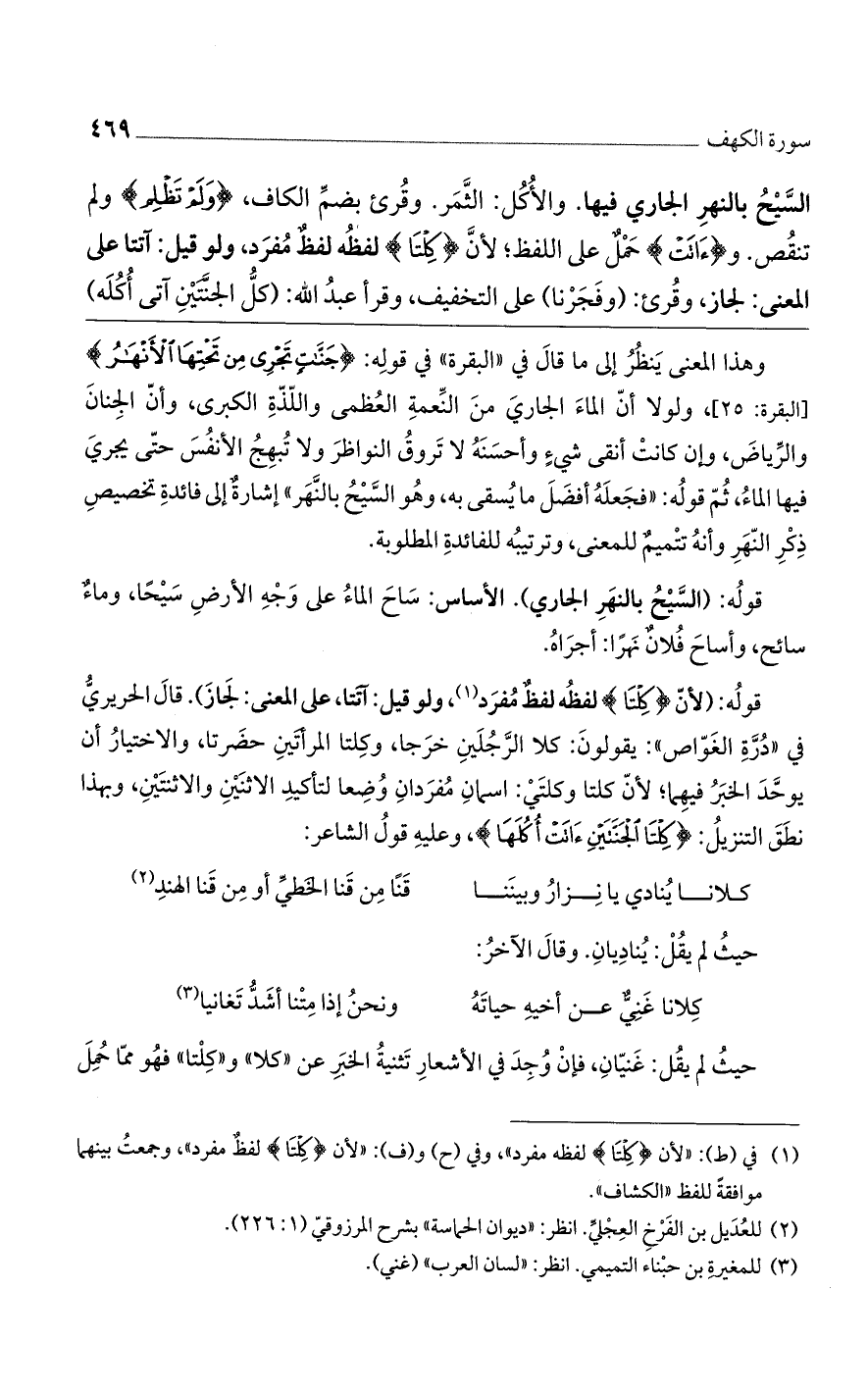 قوله: (لأن (كلتا) لفظه لفظ مفرد، ولو قيل آتتا، على المعنى: لجاز). قال الحريري في "دُرة الغواص": يقولون: كلا الرجلين خرجا، وكلتا المرأتين حضرتا، والاختيار أن يوحد الخبر فيهما؛ لأن كلتا وكلتي: اسمان مفردان وضعا لتأيد الاثنين والاثنتين، وبهذا نطق التنزيل: (كِلْتَا الْجَنَّتَيْنِ آتَتْ أُكُلَهَا)، وعليه قول الشاعر:
