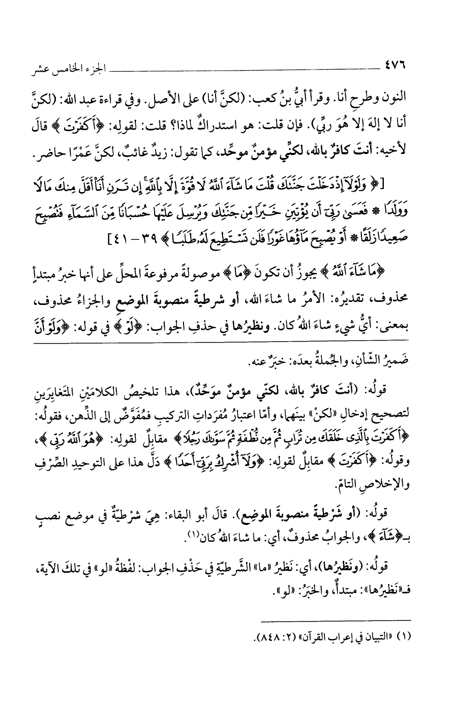 (ما شاءَ اللَّهُ) يجوز أن تكون (ما) موصولة مرفوعة المحل على أنها خبر مبتدأٍ محذوف، تقديره: الأمر ما شاء الله. أو شرطية منصوبة الموضع والجزاء محذوف، بمعنى: أي شيء شاء الله كان. ونظيرها في حذف الجواب (لَوْ) في قوله: (وَلَوْ أَنَّ