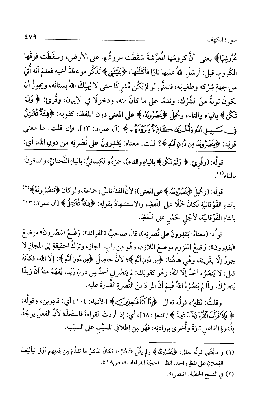 قوله: (وحُمل (يَنصُرُونَهُ) على المعنى)؛ لأن الفئة ناسٌ وجماعة، ولو كان (تَنصُرُونَهُ) بالتاء الفوقانية لكان حملاً على اللفظ، والاستشهاد بقوله: (فِئَةٌ تُقَاتِلُ) [آل عمران: 13] بالتاء الفوقانية، لأجل الحمل على اللفظ.