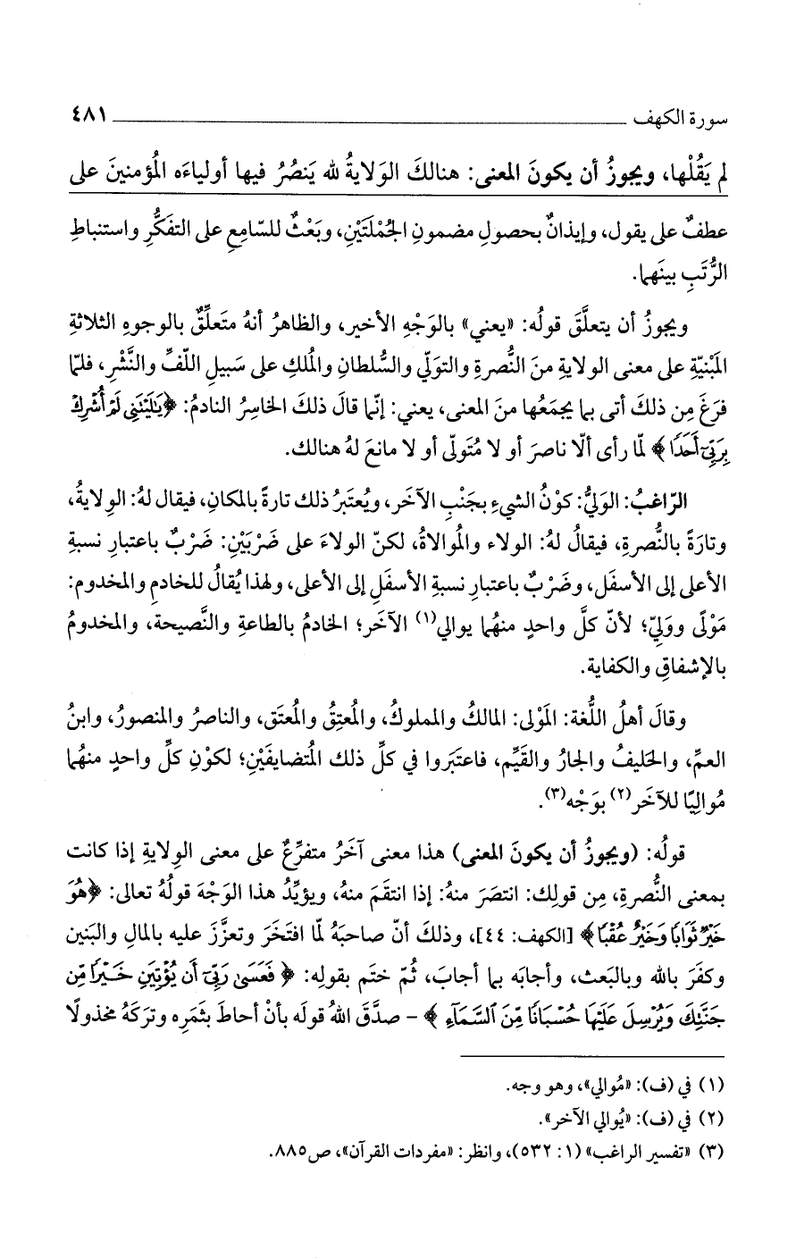ويجوز أن يتعلق قوله: "يعني" بالوجه الأخير، والظاهر أنه متعلقٌ بالوجوه الثلاثة المبنية على معنى الولاية من انصرة والتولي والسلطان والمُلك على سبيل اللف والنشر، فلما فرغ من ذلك أتى بما يجمعها من المعنى، يعني: إنما قال ذلك الخاسر النادم: (يَا لَيْتَنِي لَمْ أُشْرِكْ بِرَبِّي أَحَداً) لما رأى ألا ناصر أو لا مُتولي أو لا مانع له هنالك.