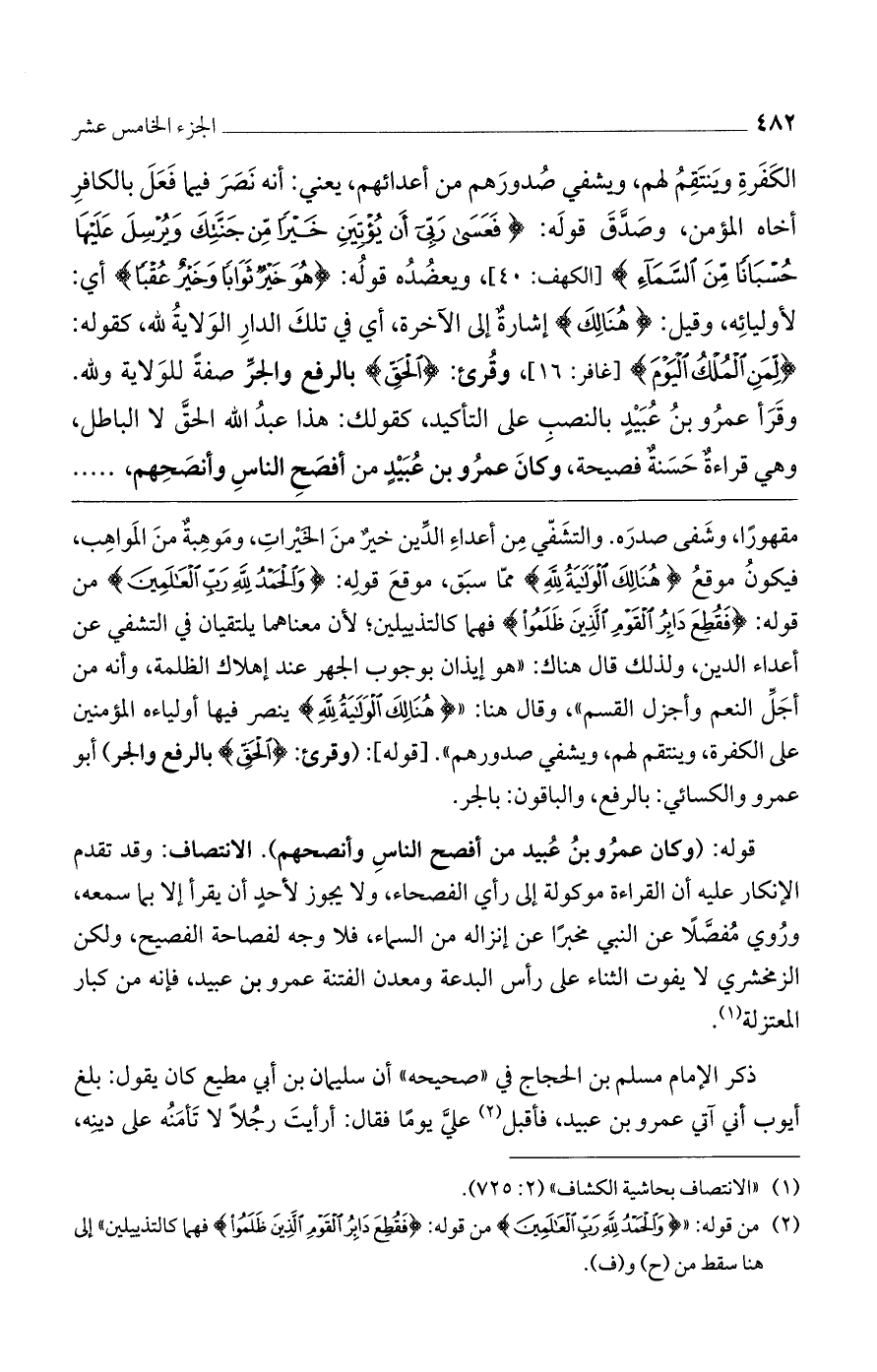 قوله: (وكان عمرو بن عبيد من أفصح الناس وأنصحهم). الانتصاف: وقد تقدم الإنكار عليه أن القراءة موولة إلى رأي الفصحاء، ولا يجوز لأحدٍ أن يقرأ إلا بما سمعهن ورُوي مفصلاً عن النبي مخبراً عن غنزاله من السماء، فلا وجه لفصاحة الفصيح، ولكن الزمخشري لا يفوت الثناء على راس البدعة ومعدن الفتنة عمرو بن عبيد، فإنه من كبار المعتزلة.