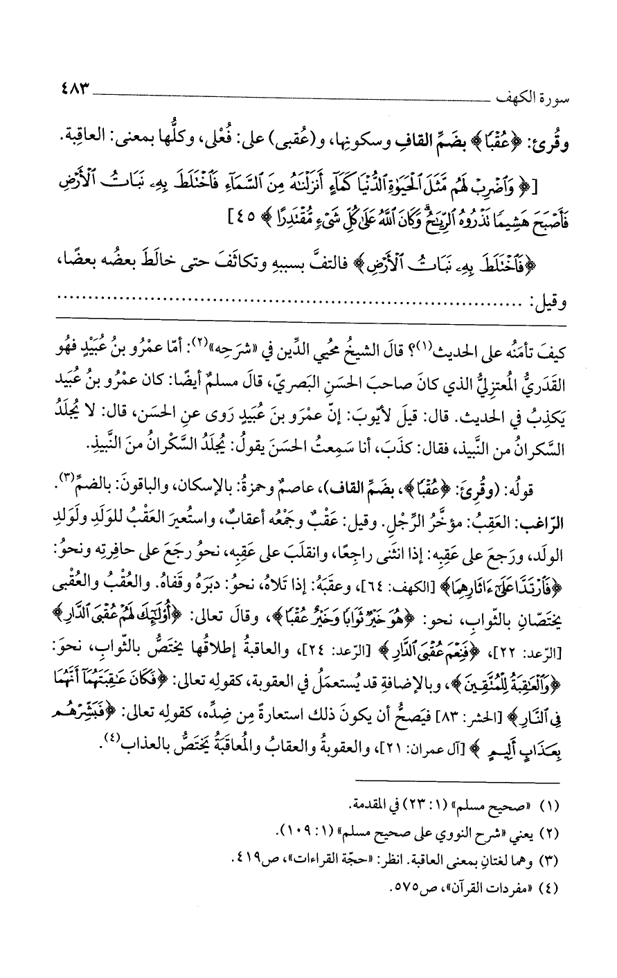 قوله: (وقرئ: (عُقْباً)، بضم القاف)، عاصمٌ وحمزة: بالإسكان، والباقون: بالضم. الراغب: العقبُ: مؤخر الرجل. وقيل: عقبٌ وجمعه أعقابٌ، واستعيرالعقب للولد ولولد الولد، ورجع على عقبه: إذا انثنى راجعاً، وانقلب على عقبه، نحو رجع على حافرته ونحو: (فَارْتَدَّا عَلَى آثَارِهِمَا) [الكهف: 64]، وعقبه: إذا تلاه، نحو: دبره وقفاه. والعقبُ والعقبى يختصان بالثواب، نحو: (هُوَ خَيْرٌ ثَوَاباً وَخَيْرٌ عُقْباً)، وقال تعالى: (أُوْلَئِكَ لَهُمْ عُقْبَى الدَّارِ) [الرعد: 22]، (فَنِعْمَ عُقْبَى الدَّارِ) [الرعد: 24]، والعاقبة إطلاقها يختص بالثواب، نحو: (وَالْعَاقِبَةُ لِلْمُتَّقِينَ)، وبالإضافة قد يستعمل في العقوبة، كقوله تعالى: (فَكَانَ عَاقِبَتَهُمَا أَنَّهُمَا فِي النَّارِ) [الحشر: 83] فيصح أن يكون ذلك استعارة من ضده، كقوله تعالى: (بَشِّرْهُمْ بِعَذَابٍ أَلِيمٍ) [آل عمران: 21]، والعقوبة والعقابُ والمعاقبة يختص بالعذاب.