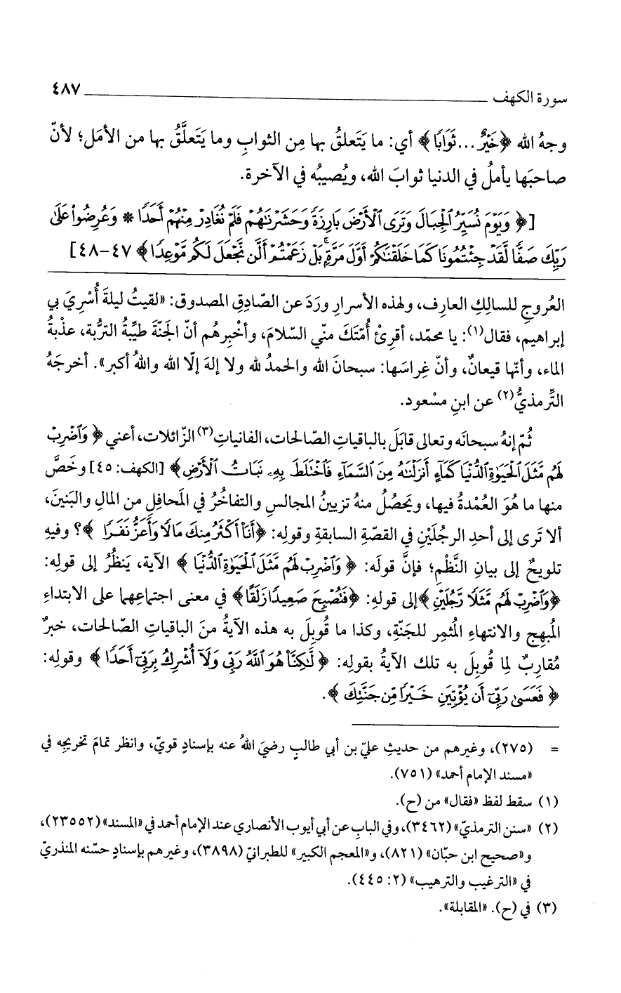 ثم إنه سبحانه وتعالى قابل بالباقيات الصالحات، الفانيات الزائلات، أعني (وَاضْرِبْ لَهُمْ مَثَلَ الْحَيَاةِ الدُّنْيَا كَمَاءٍ أَنزَلْنَاهُ مِنْ السَّمَاءِ فَاخْتَلَطَ بِهِ نَبَاتُ الأَرْضِ) [الكهف: 45] وخص منها ما هو العمدة فيها، ويحصل منه تزيين المجالس والتفاخر في المحافل من المال والبنين، ألا ترى إلى أحد الرجلين في القصة السابقة وقوله: (أَنَا أَكْثَرُ مِنْكَ مَالاً وَأَعَزُّ نَفَراً)؟ وفيه تلويح إلى بيان النظم؛ فإن قوله: (وَاضْرِبْ لَهُمْ مَثَلَ الْحَيَاةِ الدُّنْيَا) الآية، ينظر إلى قوله: (وَاضْرِبْ لَهُمْ مَثَلاً رَجُلَيْنِ) إلى قوله: فَتُصْبِحَ صَعِيداً زَلَقاً) في معنى اجتماعهما على الابتداء المبهج والانتهاء المثمر للجنة، وكذا ما قوبل به هذه الآية من الباقيات الصالحات، خبرٌ مقاربق لما قوبل به تلك الآية بقوله: (لَكِنَّا هُوَ اللَّهُ رَبِّي وَلا أُشْرِكُ بِرَبِّي أَحَداً) وقوله: (فَعَسَى رَبِّي أَنْ يُؤْتِيَنِي خَيْراً مِنْ جَنَّتِكَ).