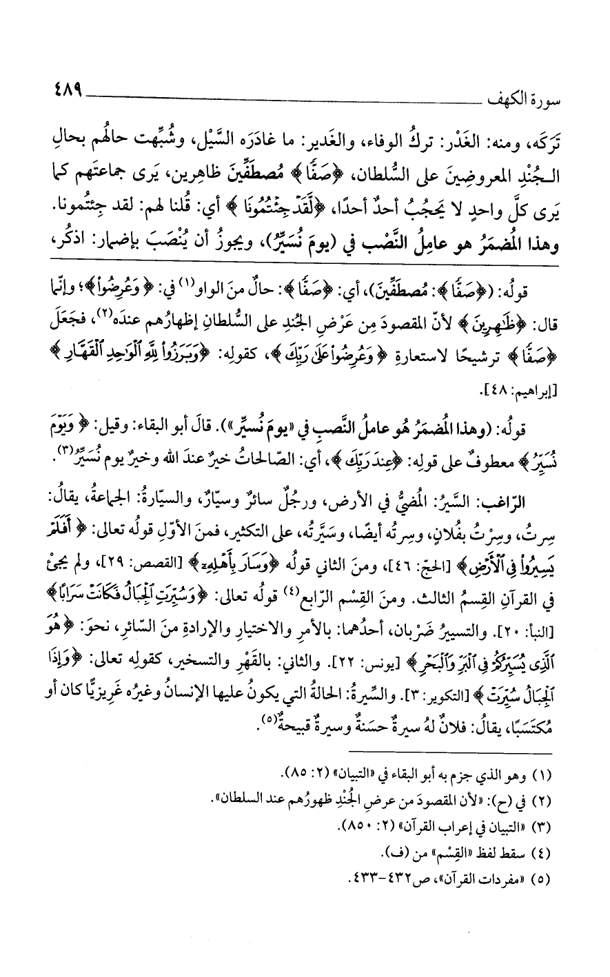 تركه، ومنه الغدر. ترك الوفاء. والغدير: ما غادره السيل. وشبهت حالهم بحال الجند المعروضين على السلطان (صفًّا) مصطفين ظاهرين، يرى جماعتهم كما يرى كل واحد لا يحجب أحد أحدا (لقَدْ جِئْتُمُونا) أي: قلنا لهم: لقد جئتمونا. وهذا المضمر هو عامل النصب في يوم نسير. ويجوز أن ينصب بإضمار: اذكر.