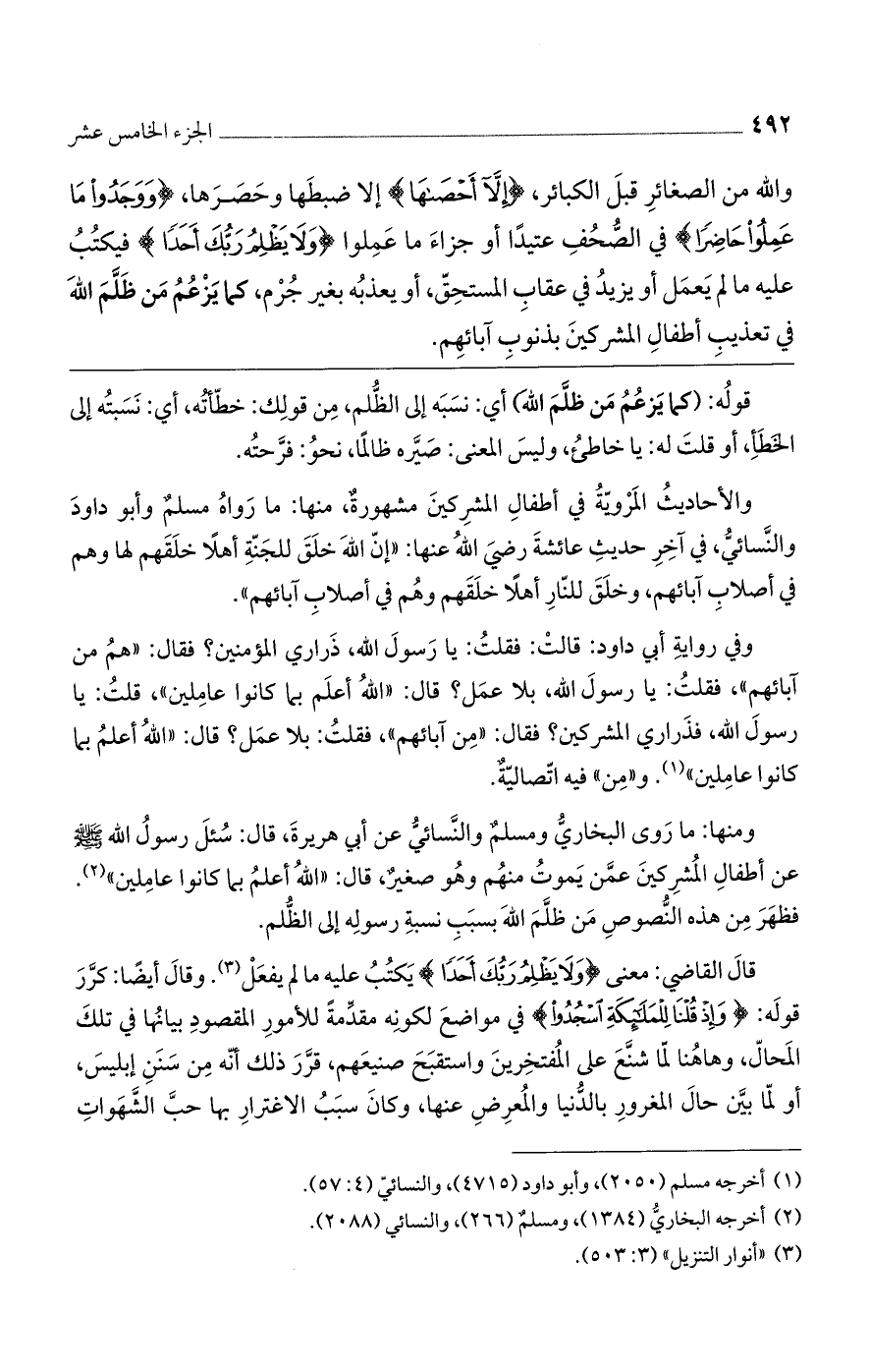 ومنها: ما روى البخاري ومسلم والنسائي عن أبي هريرة، قال: سُئل رسول الله صلى الله عليه وسلم عن أطفال المشركين عمن يموت منهم وهو صغيرٌ، قال: "الله أعلمُ بما كانوا عاملين". فظهر من هذه النصوص من ظلم الله بسبب نسبة رسوله إلى الظلم.