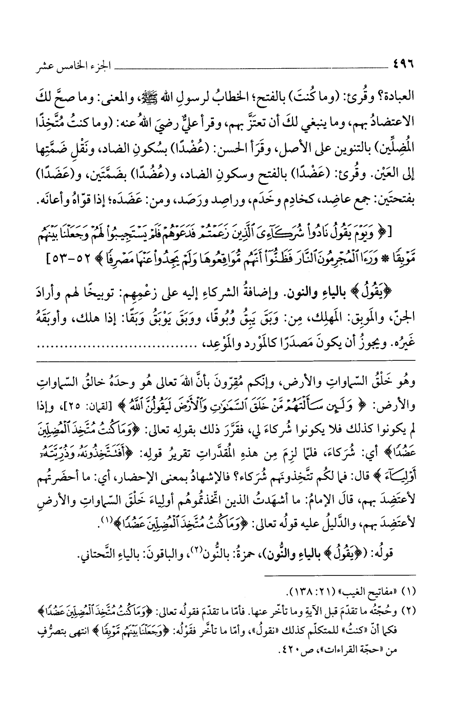 العبادة؟ وقرئ: وما كنت، بالفتح: الخطاب لرسول الله صلى الله عليه وسلم، والمعنى: وما صح لك الاعتضاد بهم، وما ينبغي لك أن تعتز بهم. وقرأ على رضى الله عنه: وما كنت متخذا المضلين، بالتنوين على الأصل. وقرأ الحسن: عضدا، بسكون الضاد، ونقل ضمتها إلى العين. وقرئ: عضداً، بالفتح وسكون الضاد. وعضدا، بضمتين وعضدا بفتحتين: جمع عاضد، كخادم وخدم، وراصد ورصد، من عضده: إذا قواه وأعانه.