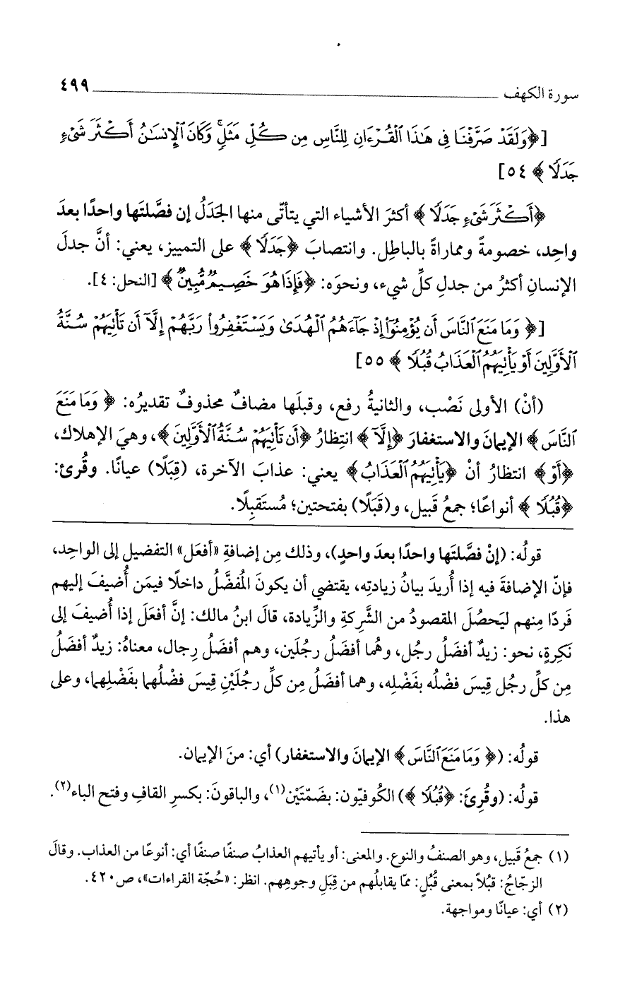 (أَنْ) الأولى نصب. والثانية رفع، وقبلها مضاف محذوف تقديره وَما مَنَعَ النَّاسَ الإيمان والاستغفار (إِلَّا) انتظار (أَنْ تَاتِيَهُمْ سُنَّةُ الْأَوَّلِينَ)، وهي الإهلاك (أَوْ) انتظار أن (يَاتِيَهُمُ الْعَذابُ) يعني: عذاب الآخرة (قِبُلًا) عياناً. وقرئ (قبلا) أنواعاً: جمع قبيل. و «قبلا» بفتحتين: مستقبلا.