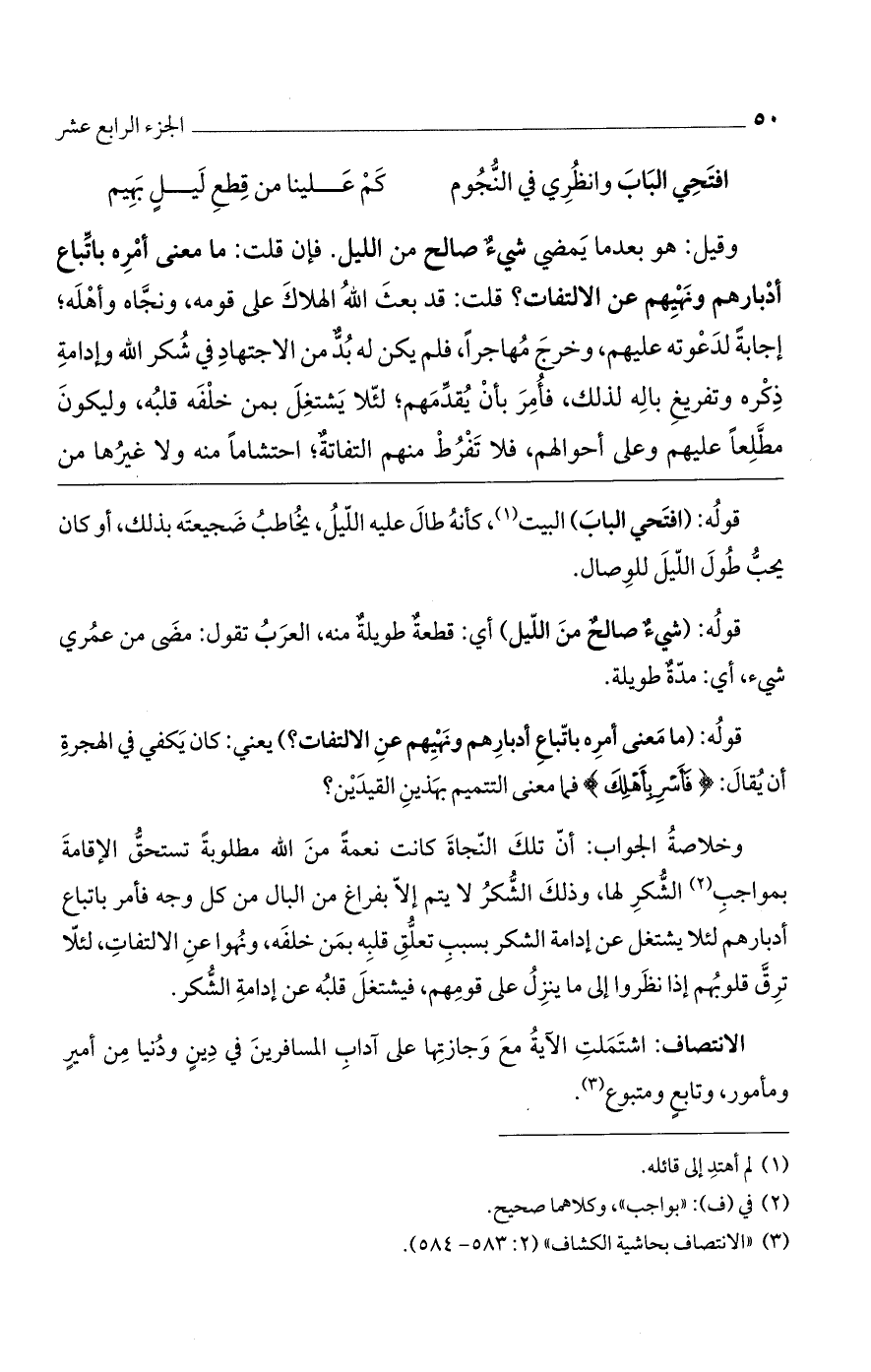وخلاصة الجواب: أن تلك النجاة كانت نعمة من الله مطلوبة تستحق الإقامة بمواجب الشكر لها، وذلك الشكر لا يتم إلا بفراغ من البال من كل وجه فأمر باتباع أدبارهم لئلا يشتغل عن إدامة الشكل بسبب تعلق قلبه بمن خلفه، ونُهوا عن الالتفات، لئلا ترق قلوبهم إذا نظروا إلى ما ينزلُ على قومهم، فيشتغل قلبه عن إدامة الشُّكر.