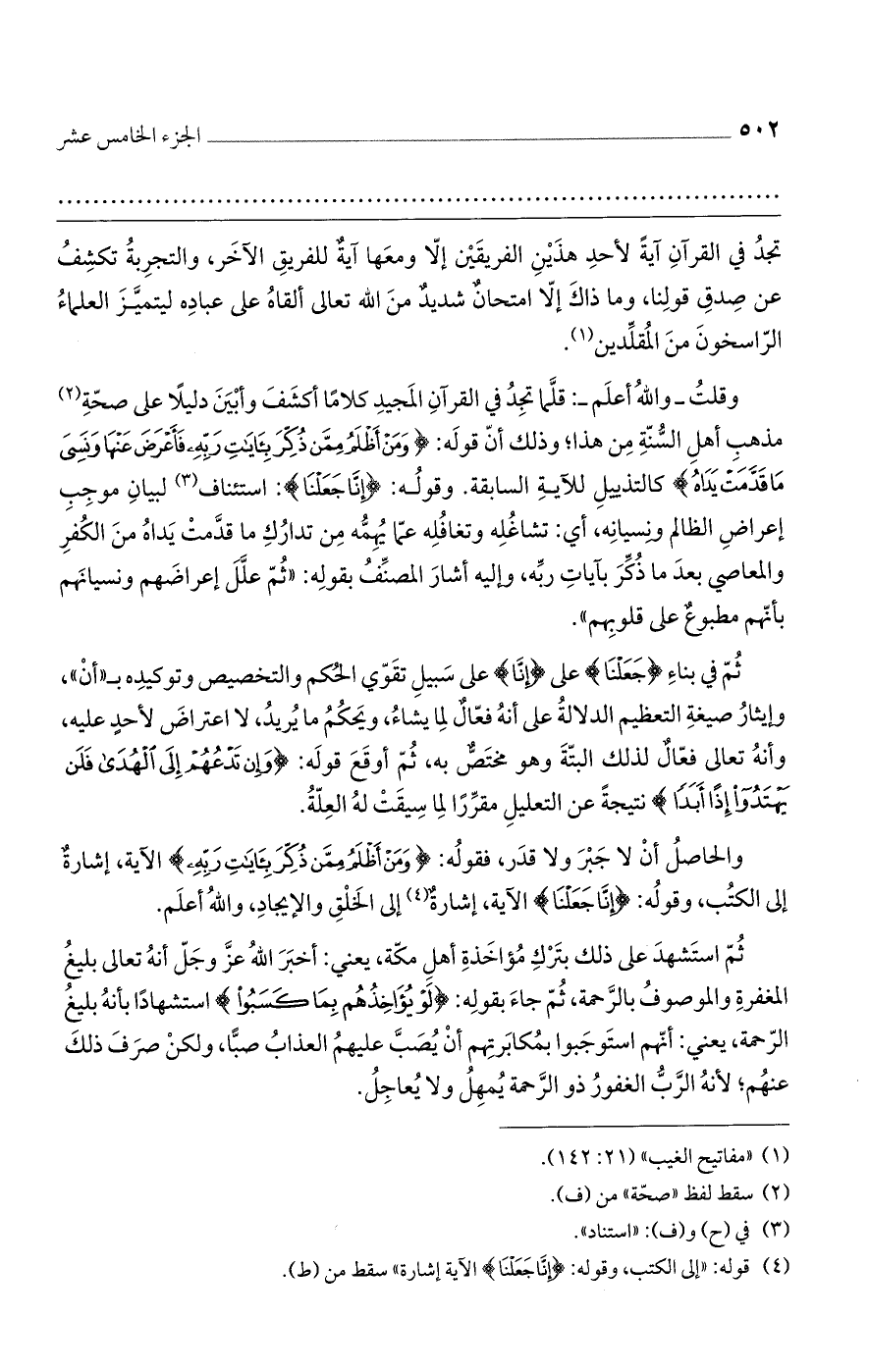 والحاصل أن لا جبر ولا قدر، فقوله: (وَمَنْ أَظْلَمُ مِمَّنْ ذُكِّرَ بِآيَاتِ رَبِّهِ) الآية، إشارة إلى الكتب، وقوله: ((إَنَّا جَعَلْنَا) الآية، إشارة إلى الخلق والإيجاد، والله أعلم.