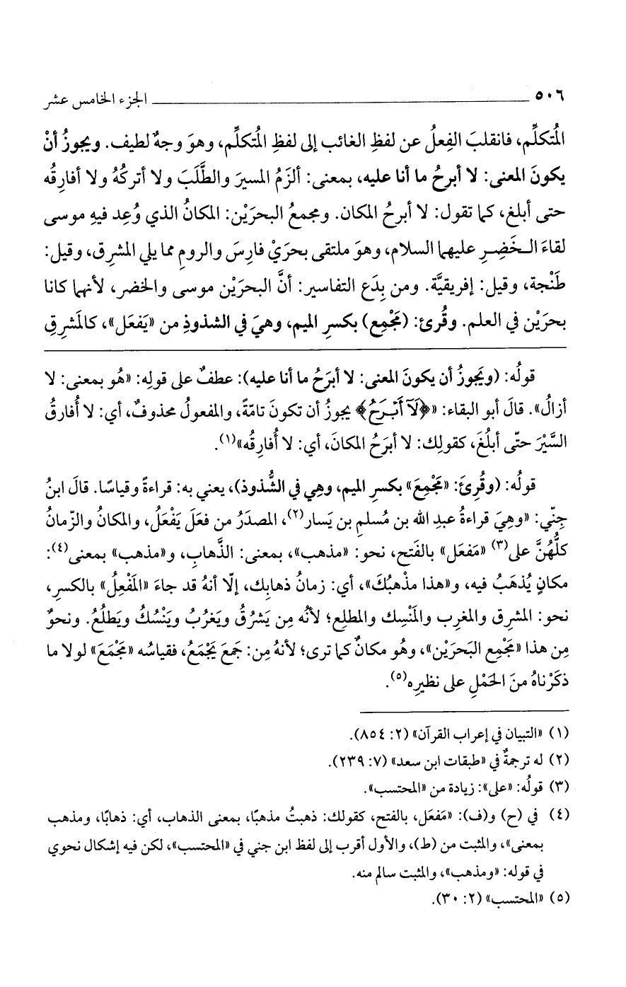 المتكلم، فانقلب الفعل عن لفظ الغائب إلى لفظ المتكلم، وهو وجه لطيف. ويجوز أن يكون. المعنى: لا أبرح ما أنا عليه، بمعنى: ألزم المسير والطلب ولا أتركه ولا أفارقه حتى أبلغ، كما تقول: لا أبرح المكان. ومجمع البحرين: المكان الذي وعد فيه موسى لقاء الخضر عليهما السلام، وهو ملتقى بحري فارس والروم مما يلي المشرق. وقيل: طنجة. وقيل: إفريقية. ومن بدع التفاسير: أن البحرين موسى والخضر، لأنهما كانا بحرين في العلم. وقرئ (مَجْمَعَ) بكسر الميم، وهي في الشذوذ من يفعل، كالمشرق