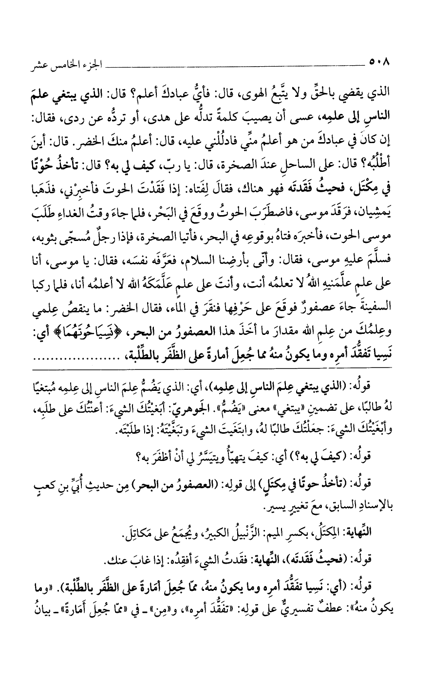 الذي يقضي بالحق ولا يتبع الهوى. قال: فأيّ عبادك أعلم؟ قال: الذي يبتغى علم الناس إلى علمه، عسى أن يصيب كلمة تدله على هدى، أو تردّه عن ردى. فقال: إن كان في عبادك من هو أعلم منى فادللني عليه. قال: أعلم منك الخضر. قال: أين أطلبه؟ قال: على الساحل عند الصخرة. قال: يا رب، كيف لي به؟ قال: تأخذ حوتا في مكتل، فحيث فقدته فهو هناك. فقال لفتاه: إذا فقدت الحوت فأخبرنى، فذهبا يمشيان، فرقد موسى، فاضطرب الحوت ووقع في البحر، فلما جاء وقت الغداء طلب موسى الحوت، فأخبره فتاه بوقوعه في البحر، فأتيا الصخرة، فإذا رجل مسجى بثوبه، فسلم عليه موسى، فقال: وأنى بأرضنا السلام، فعرّفه نفسه، فقال: يا موسى، أنا على علم علمنّيه الله لا تعلمه أنت، وأنت على علم علمكه الله لا أعلمه أنا. فلما ركبا السفينة جاء عصفور فوقع على حرفها فنقر في الماء فقال الخضر: ما ينقص علمى وعلمك من علم الله مقدار ما أخذ هذا العصفور من البحر (نَسِيا حُوتَهُما) أي نسيا تفقد أمره وما يكون منه مما جعل أمارة على الظفر بالطلبة.