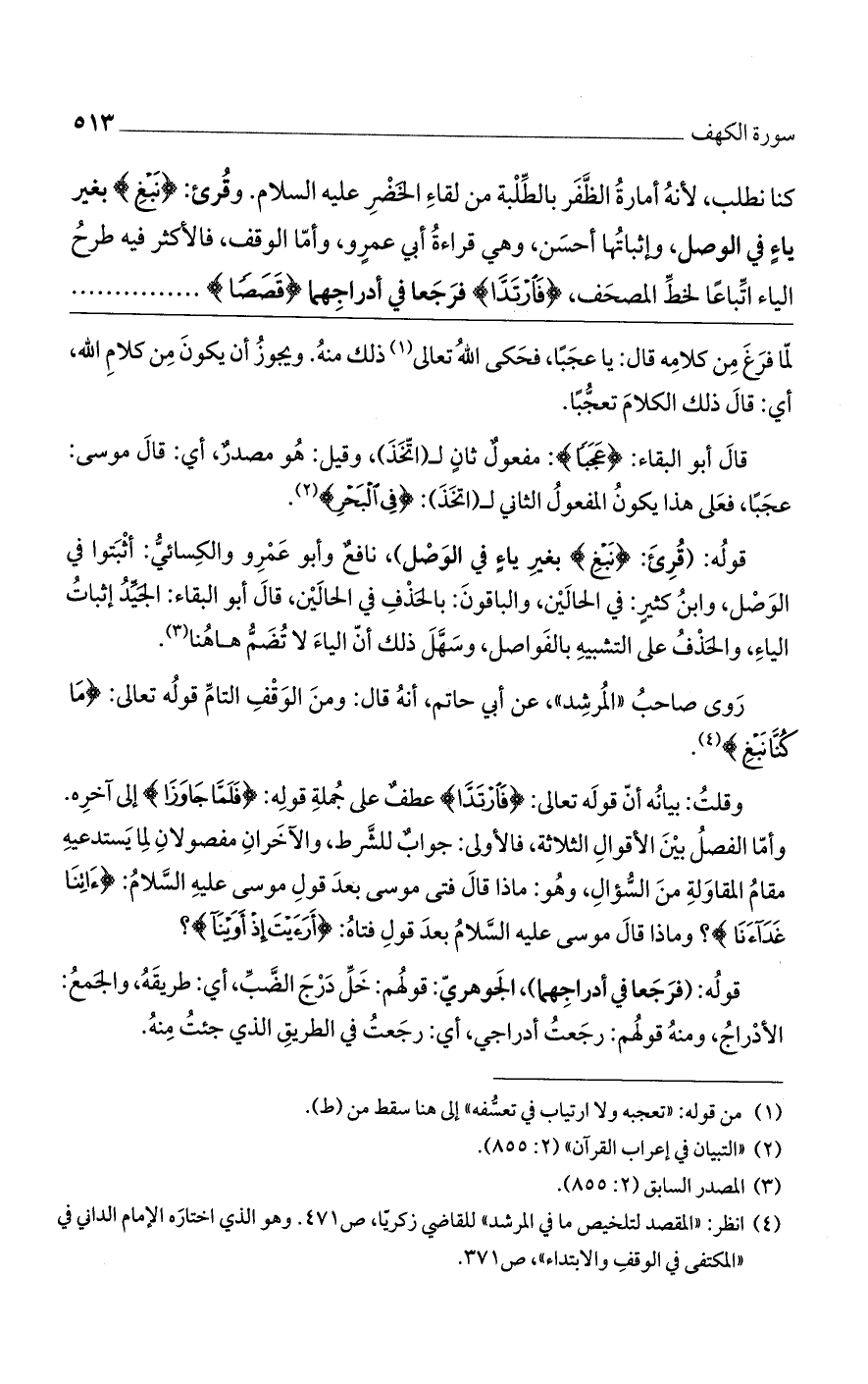 كنا نطلب، لأنه أمارة الظفر بالطلبة من لقاء الخضر عليه السلام. وقرئ (نَبْغِ) بغير ياء في الوصل، وإثباتها أحسن، وهي قراءة أبي عمرو، وأمّا الوقف، فالأكثر فيه طرح الياء اتباعا لخط المصحف (فَارْتَدَّا) فرجعا في أدراجهما (قَصَصاً) .......