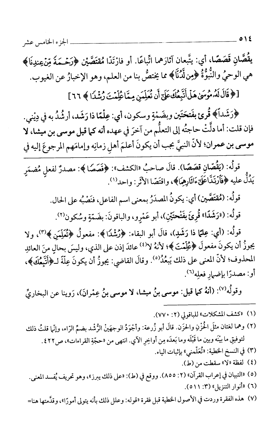 قوله: (أي: علماً ذا رشدٍ)، قال أبو البقاء: (رُشْداً): مفعول 0 تُعَلِّمَنِي)، ولا يجوز أن يكون مفعول (عُلِّمْتَ)؛ لأنه لا عائد إذن على الذي، وليس بحال ٍمن العائد المحذوف؛ لأن المعنى على ذلك يبعد. وقال القاضي: يجوز ان يكون علة لـ (أَتَّبِعُكَ)، أو: مصدراً بإضمار فعله.