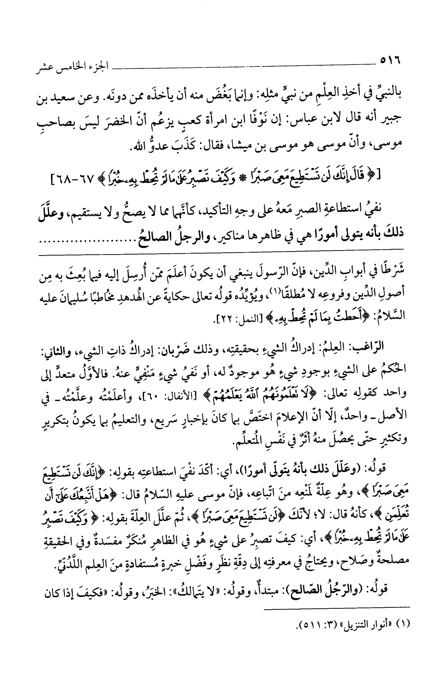 قوله: (وعلل ذلك بأنه يتولى أموراً)، أي: أكد نفي استطاعته بقوله: (إِنَّكَ لَنْ تَسْتَطِيعَ مَعِي صَبْراً)، وهو علة لمنعه من اتباعه، فإن موسى عليه السلام قال: (هَلْ أَتَّبِعُكَ عَلَى أَنْ تُعَلِّمَنِ)، كأنه قال: لا؛ لأنك (لَنْ تَسْتَطِيعَ مَعِي صَبْراً)، ثم علل العلة بقوله: (وَكَيْفَ تَصْبِرُ عَلَى مَا لَمْ تُحِطْ بِهِ خُبْراً)، أي: كيف تصبرُ على شيء هو في الظاهر منكرٌ مفسدةٌ وفي الحقيقة مصلحة وصلاح، ويحتاج في معرفته إلى دقة نظر وفضل خبرة مستفادة منالعلم اللدني.