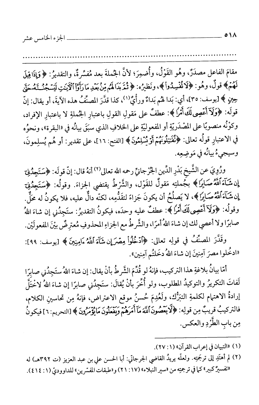 ورُوي عن الشيخ بدر الدين الجرجاني رحمه الله تعالى أنه قال: إن قوله: (سَتَجِدُنِي إِنْ شَاءَ اللَّهُ صَابِراً) بجملته مقولٌ للقول، والشرط يقتضي الجزاء. وقوله: (سَتَجِدُنِي إِنْ شَاءَ اللَّهُ صَابِراً)، لا يصلح أن يكون جزاء لتقدمه، لنه دالٌ عليه، فلا يكون له محل. وقوله: (وَلا أَعْصِي لَكَ أَمْراً): عطفٌ عليه وحده، فيكون التقدير: ستجدني إن شاء الله صابراً ولا أعصي لك إن شاء الله أمراً، والشرط مع الجزاء المحذوف معترضٌ بين المفعولين.