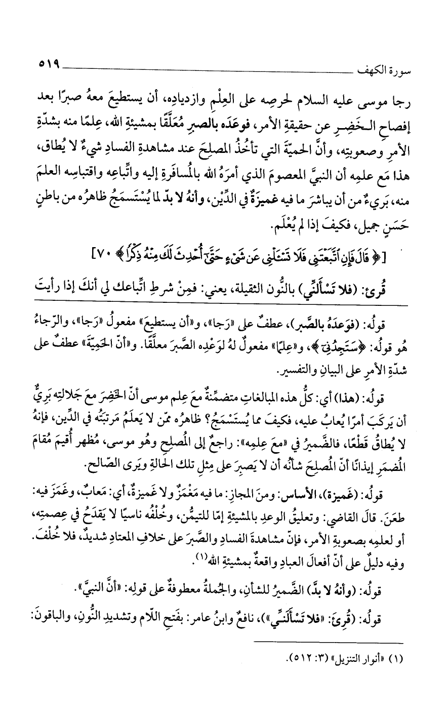 قوله: (فوعده بالصبر)، عطفٌ على "رجا"، و"أن يستطيع" مفعول "رجا"، والرجاء هو قوله: (سَتَجِدُنِي)، و"علماً" مفعولٌ له لوعده الصبر معلقاً. و"أن الحمية" عطفٌ على شدة الأمر على البيان والتفسير.