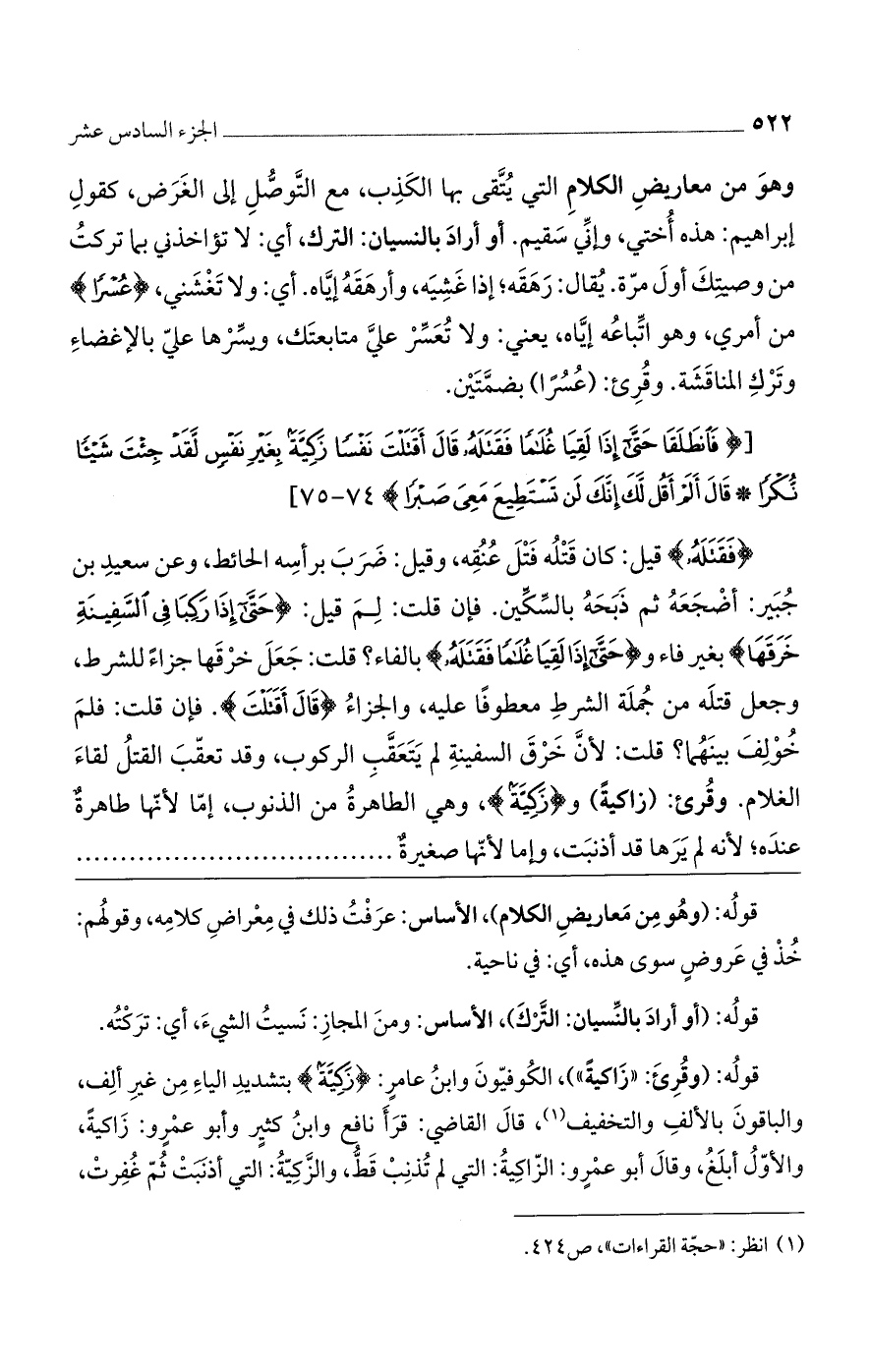(فَقَتَلَهُ) قيل: كان قتله قتل عنقه. قيل: ضرب برأسه الحائط، وعن سعيد بن جبير: أضجعه ثم ذبحه بالسكين. فإن قلت: لم قيل: (حَتَّى إِذا رَكِبا فِي السَّفِينَةِ خَرَقَها) بغير فاء؟ و (حَتَّى إِذا لَقِيا غُلاماً فَقَتَلَهُ) بالفاء؟ قلت: جعل خرقها جزاء للشرط، وجعل قتله من جملة الشرط معطوفاً عليه، والجزاء (قالَ أَقَتَلْتَ). فإن قلت: فلم خولف بينهما؟ قلت: لأن خرق السفينة لم يتعقب الركوب، وقد تعقب القتل لقاء الغلام. وقرئ: (زاكية)، و (زكية)، وهي الطاهرة من الذنوب، إما لأنها طاهرة عنده لأنه لم يرها قد أذنبت، وإما لأنها صغيرةٌ